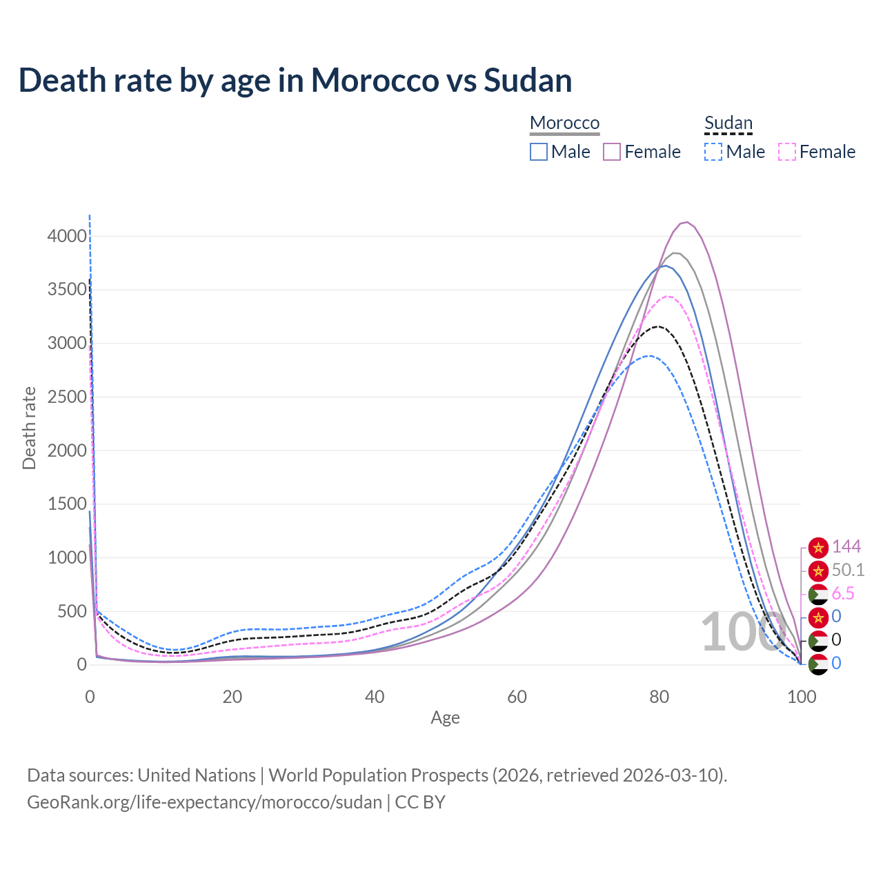 In Morocco, the most common age of death is 82, compared to 0 in Sudan. The median age of death is 79.3 in Morocco and 74.1 in Sudan, meaning only half of each cohort is expected to live past that age.