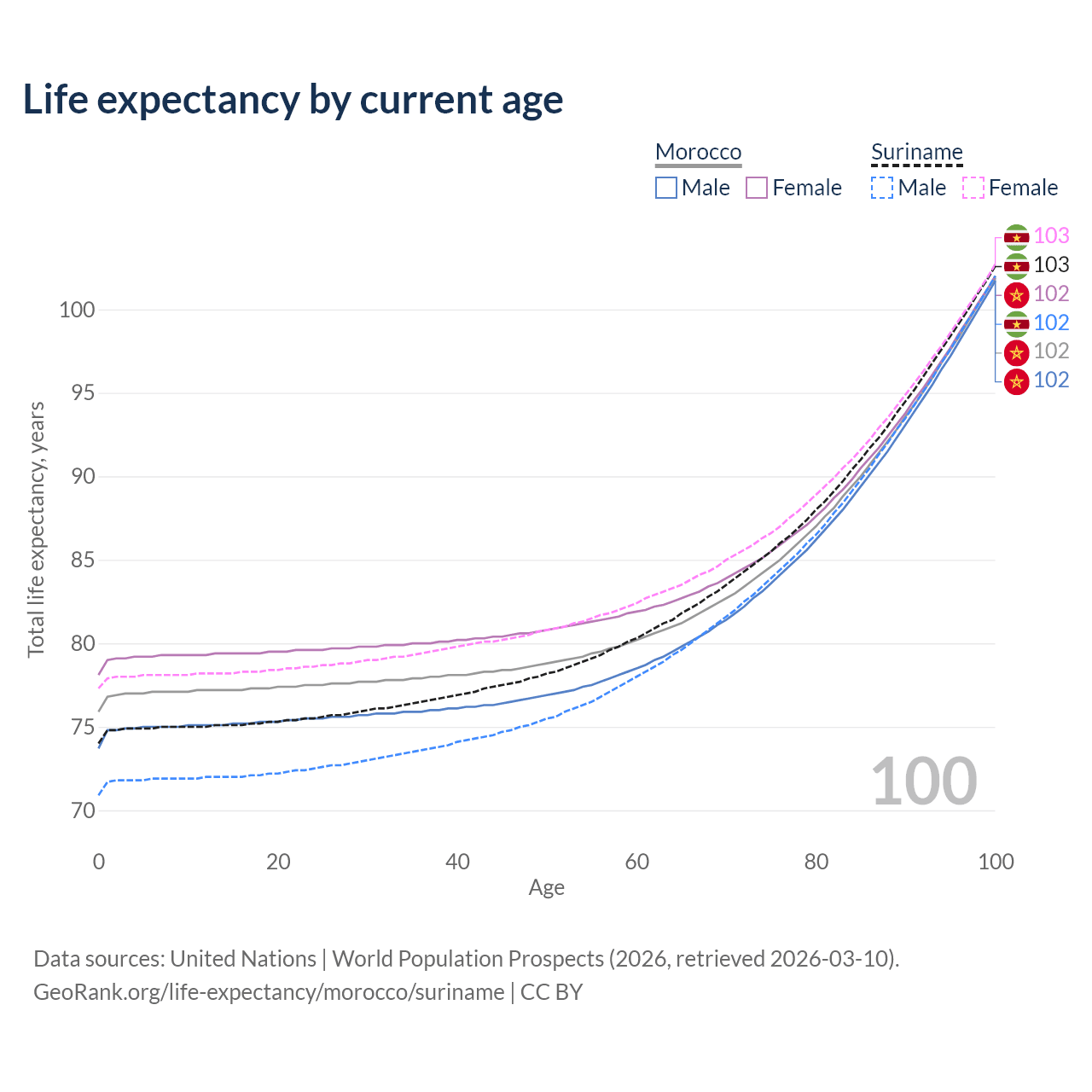 This life expectancy calculator shows the odds of living to 100, 95, 90, and below based on current age for both males and females in Morocco and Suriname, along with mean and median age of death. The calculations are based on the 2026 life tables (actuarial tables) from the UN World Population Prospects.