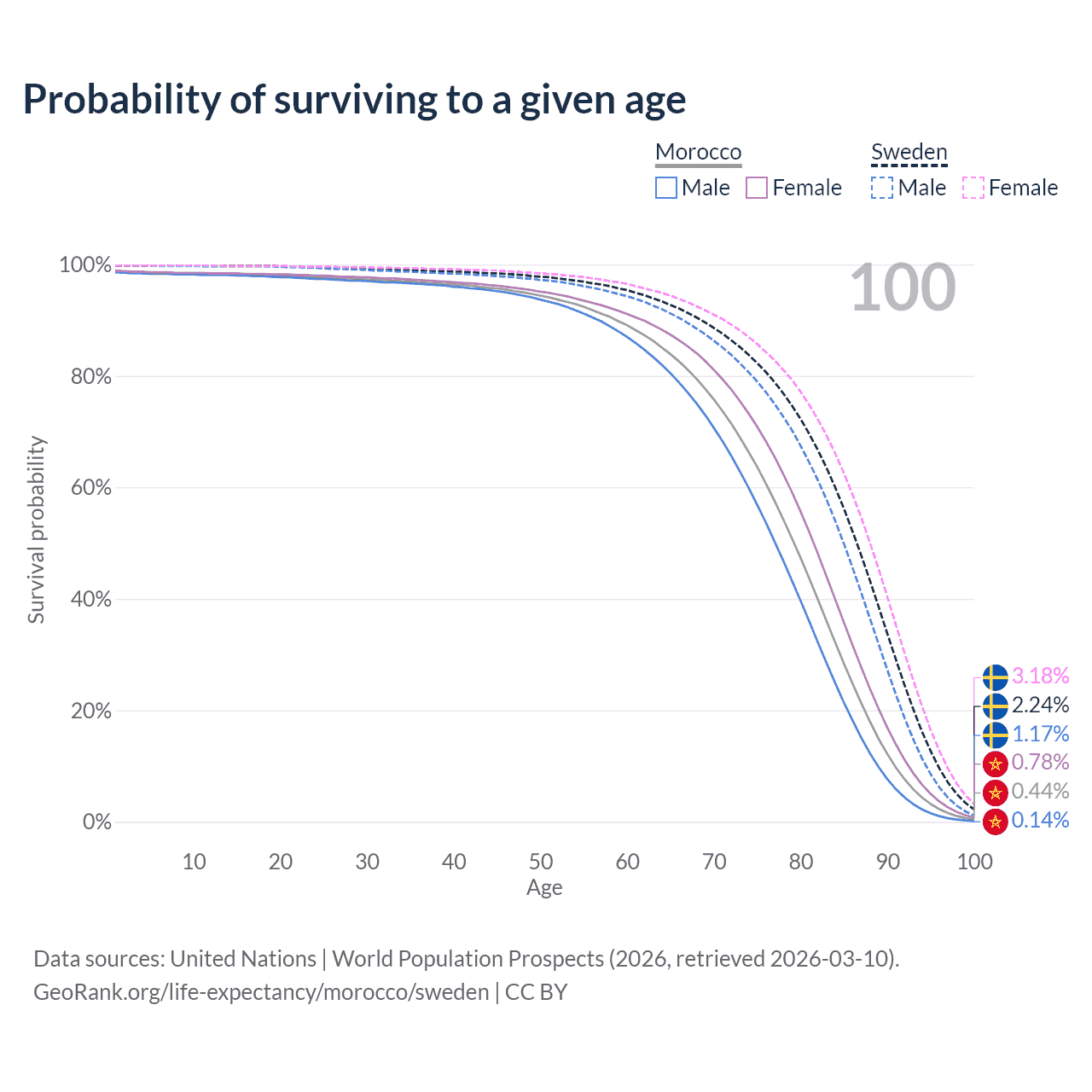 This life expectancy calculator shows the odds of living to 100, 95, 90, and below based on current age for both males and females in Morocco and Sweden, along with mean and median age of death. The calculations are based on the 2026 life tables (actuarial tables) from the UN World Population Prospects.