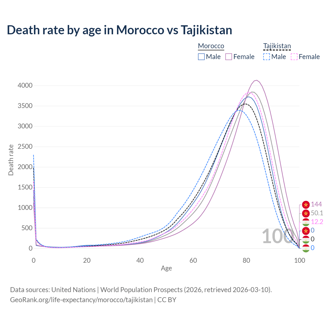 In Morocco, the most common age of death is 82, compared to 80 in Tajikistan. The median age of death is 79.3 in Morocco and 76 in Tajikistan, meaning only half of each cohort is expected to live past that age.
