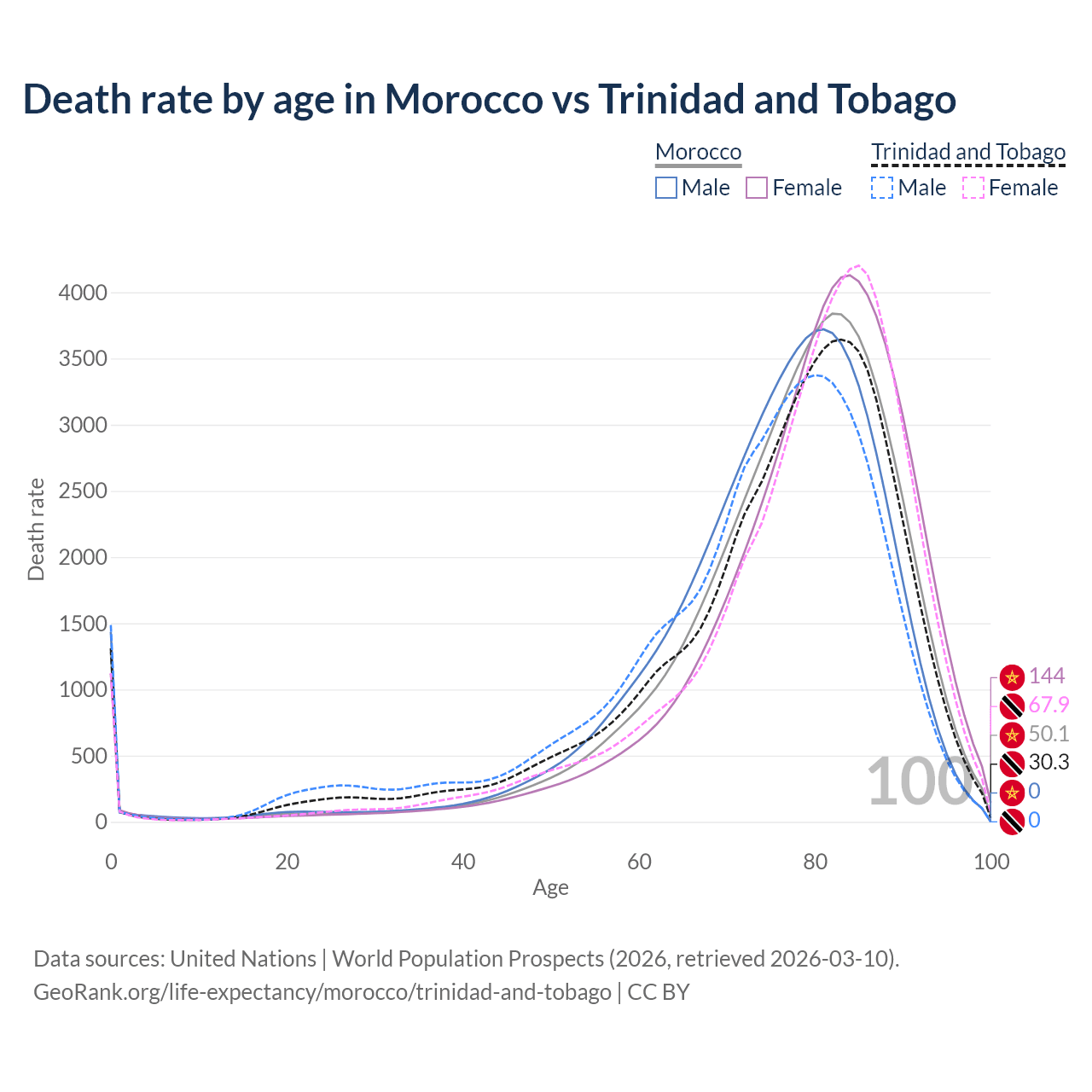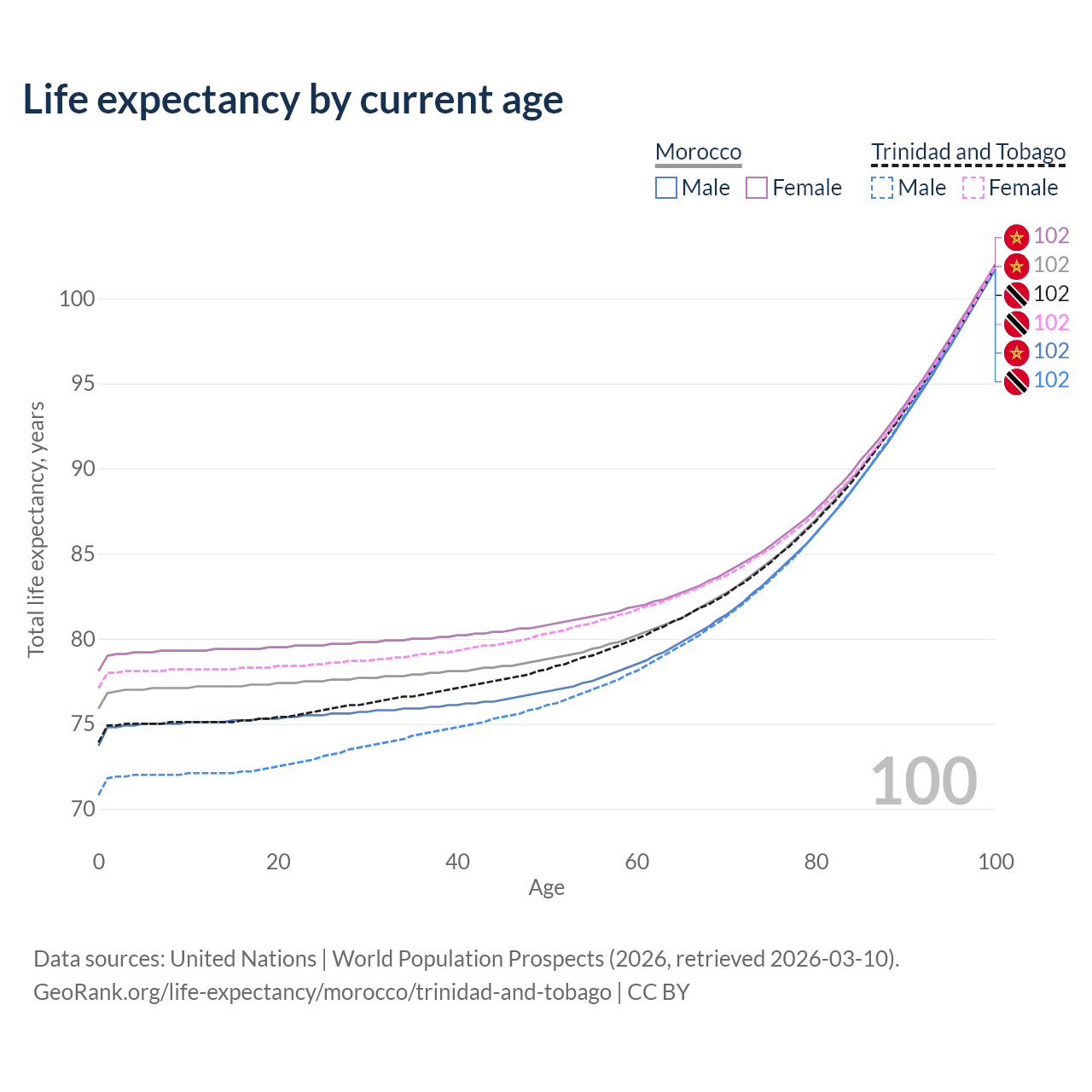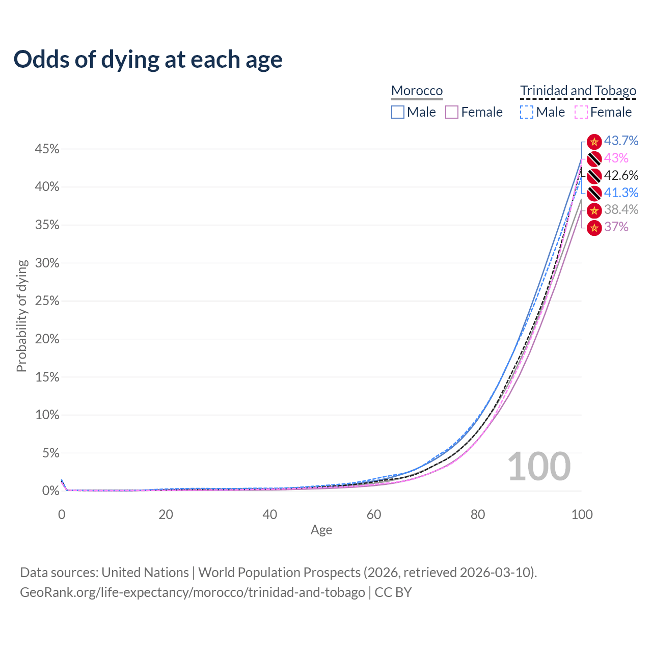 This life expectancy calculator shows the odds of living to 100, 95, 90, and below based on current age for both males and females in Morocco and Trinidad and Tobago, along with mean and median age of death. The calculations are based on the 2026 life tables (actuarial tables) from the UN World Population Prospects.