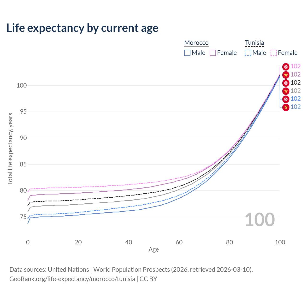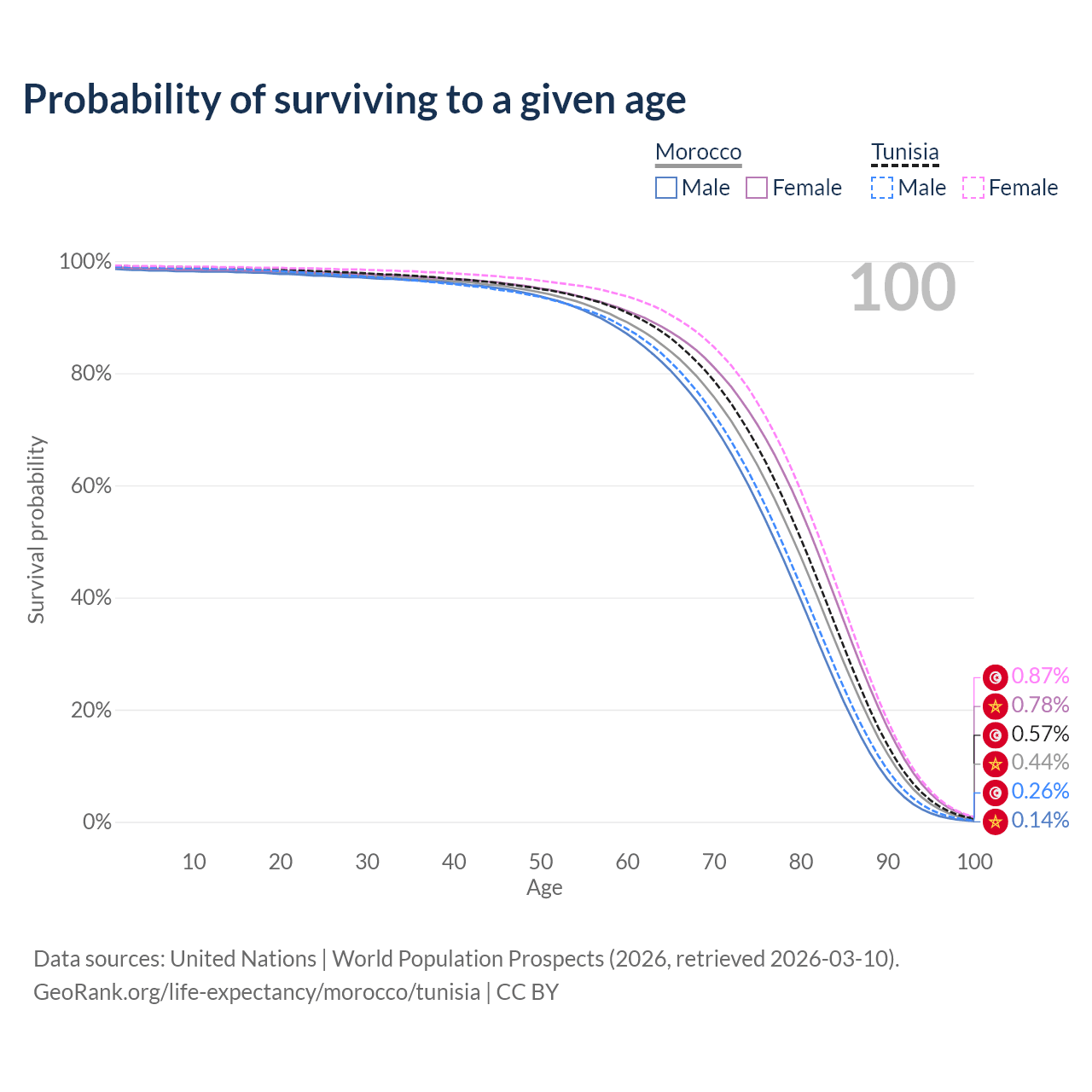 This life expectancy calculator shows the odds of living to 100, 95, 90, and below based on current age for both males and females in Morocco and Tunisia, along with mean and median age of death. The calculations are based on the 2026 life tables (actuarial tables) from the UN World Population Prospects.