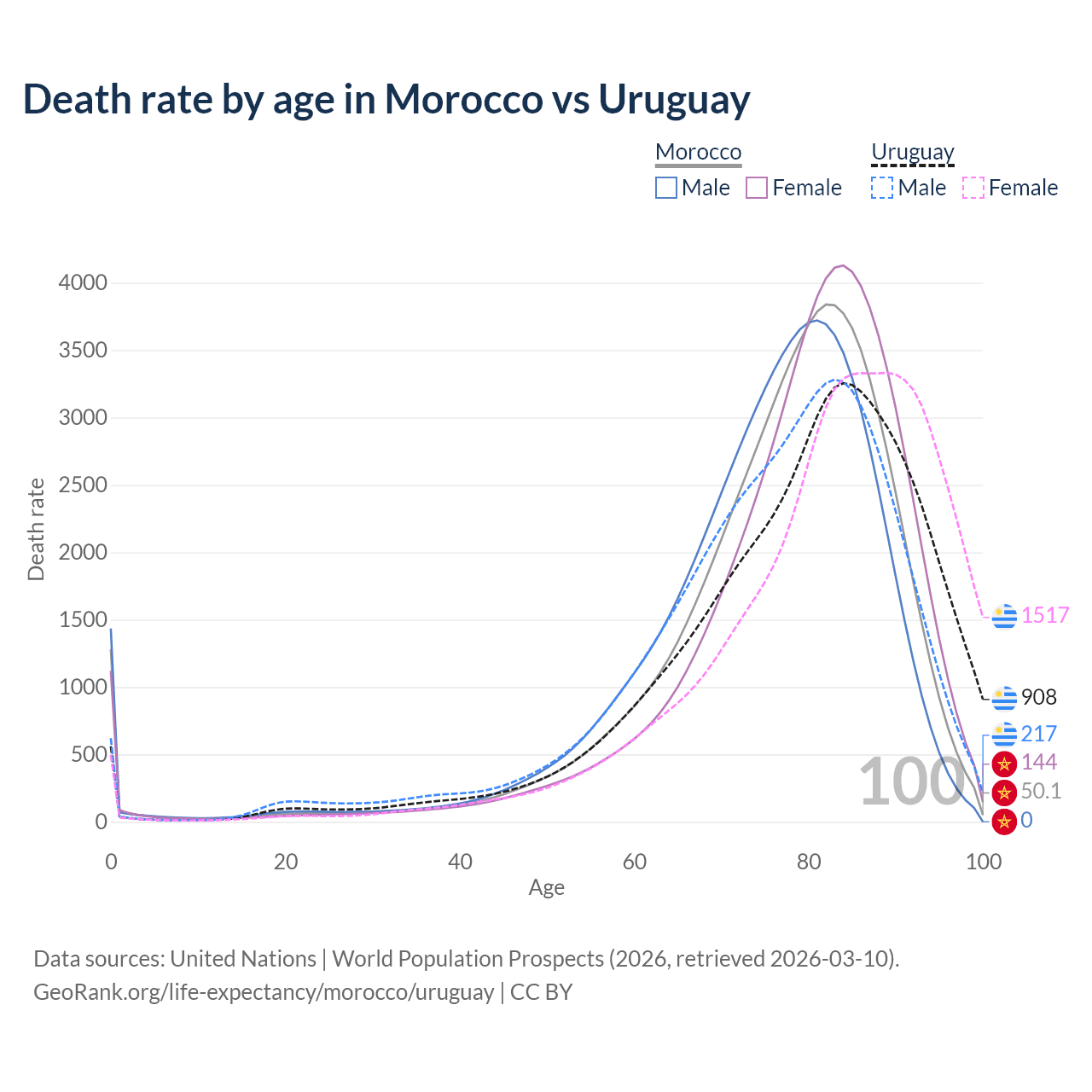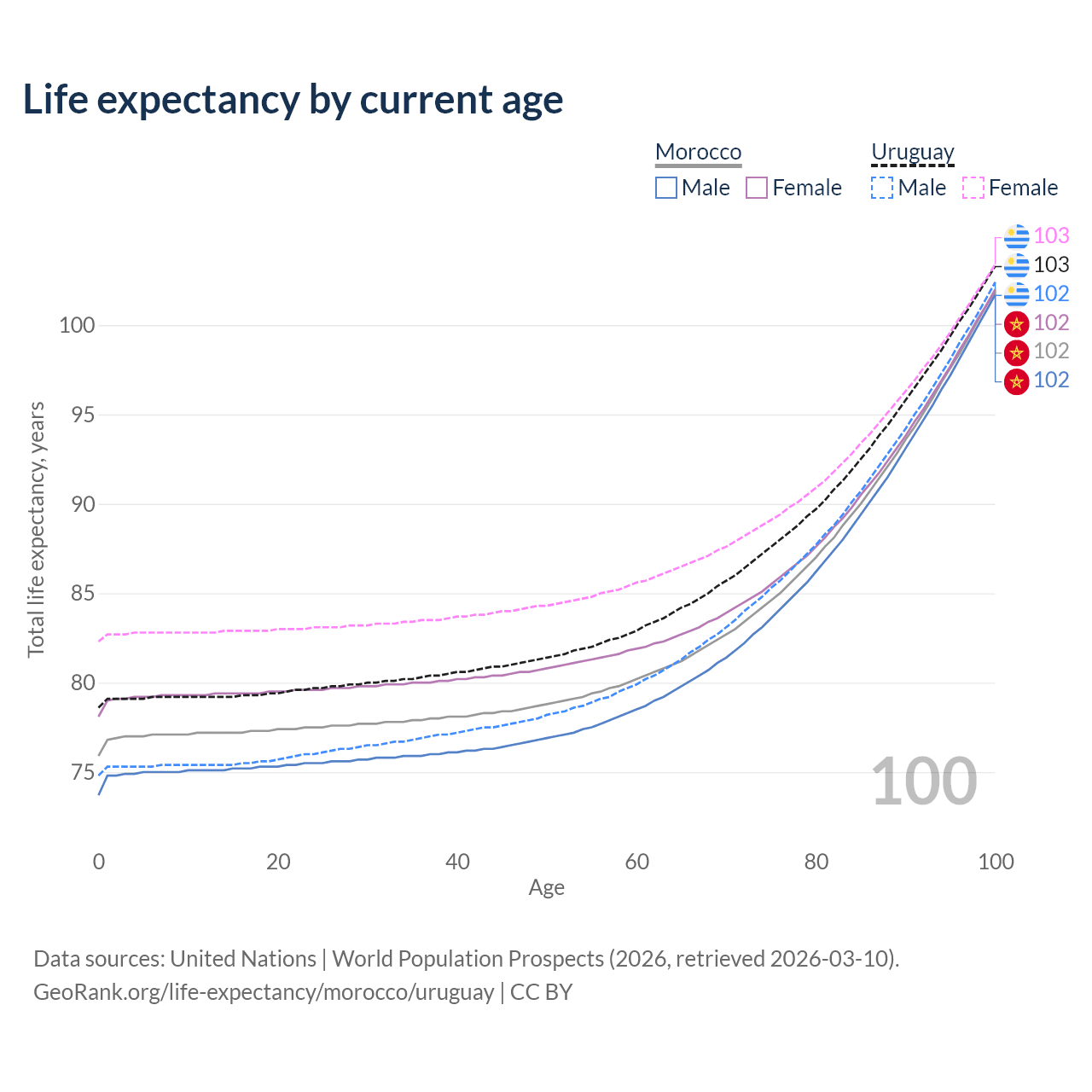 This life expectancy calculator shows the odds of living to 100, 95, 90, and below based on current age for both males and females in Morocco and Uruguay, along with mean and median age of death. The calculations are based on the 2026 life tables (actuarial tables) from the UN World Population Prospects.