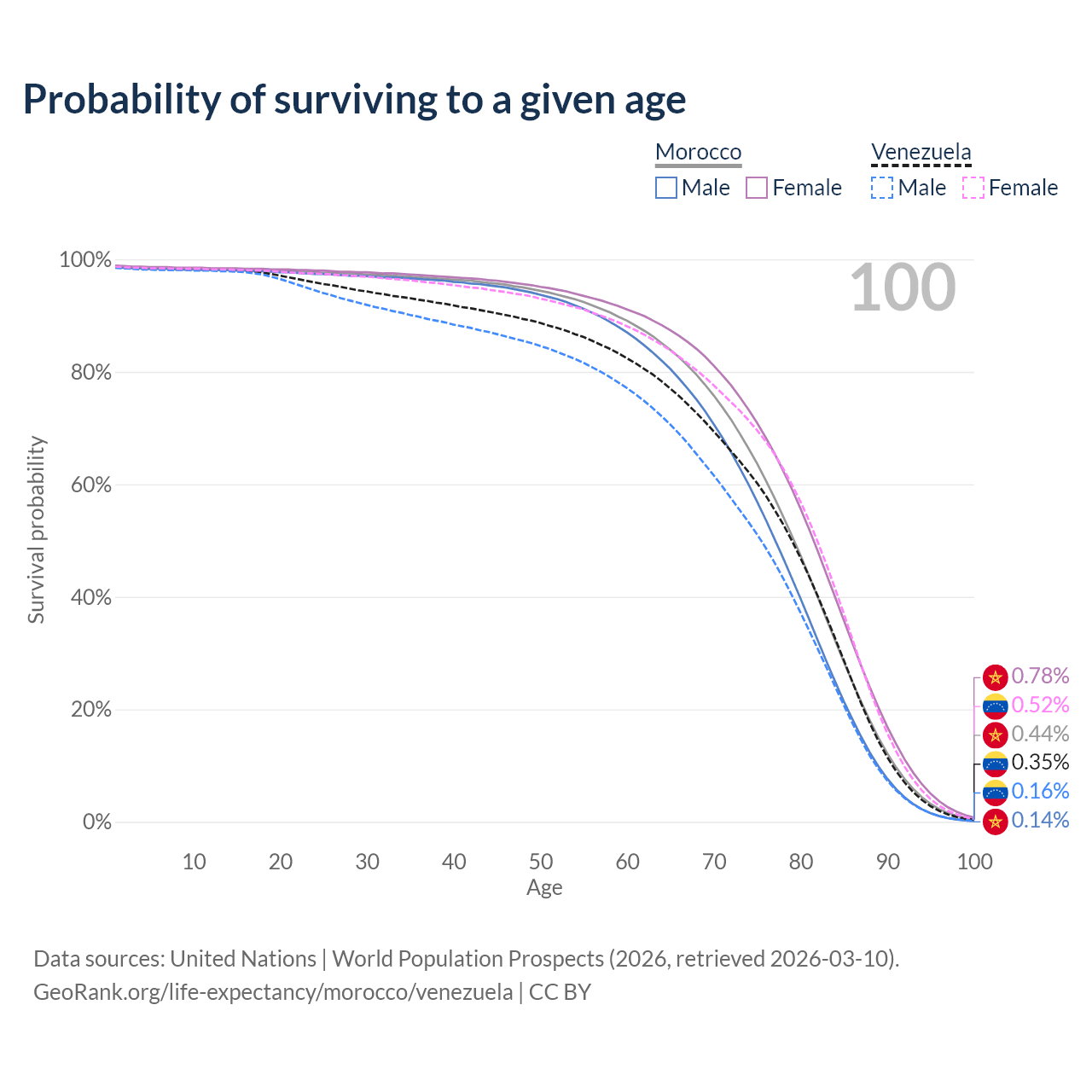This life expectancy calculator shows the odds of living to 100, 95, 90, and below based on current age for both males and females in Morocco and Venezuela, along with mean and median age of death. The calculations are based on the 2026 life tables (actuarial tables) from the UN World Population Prospects.