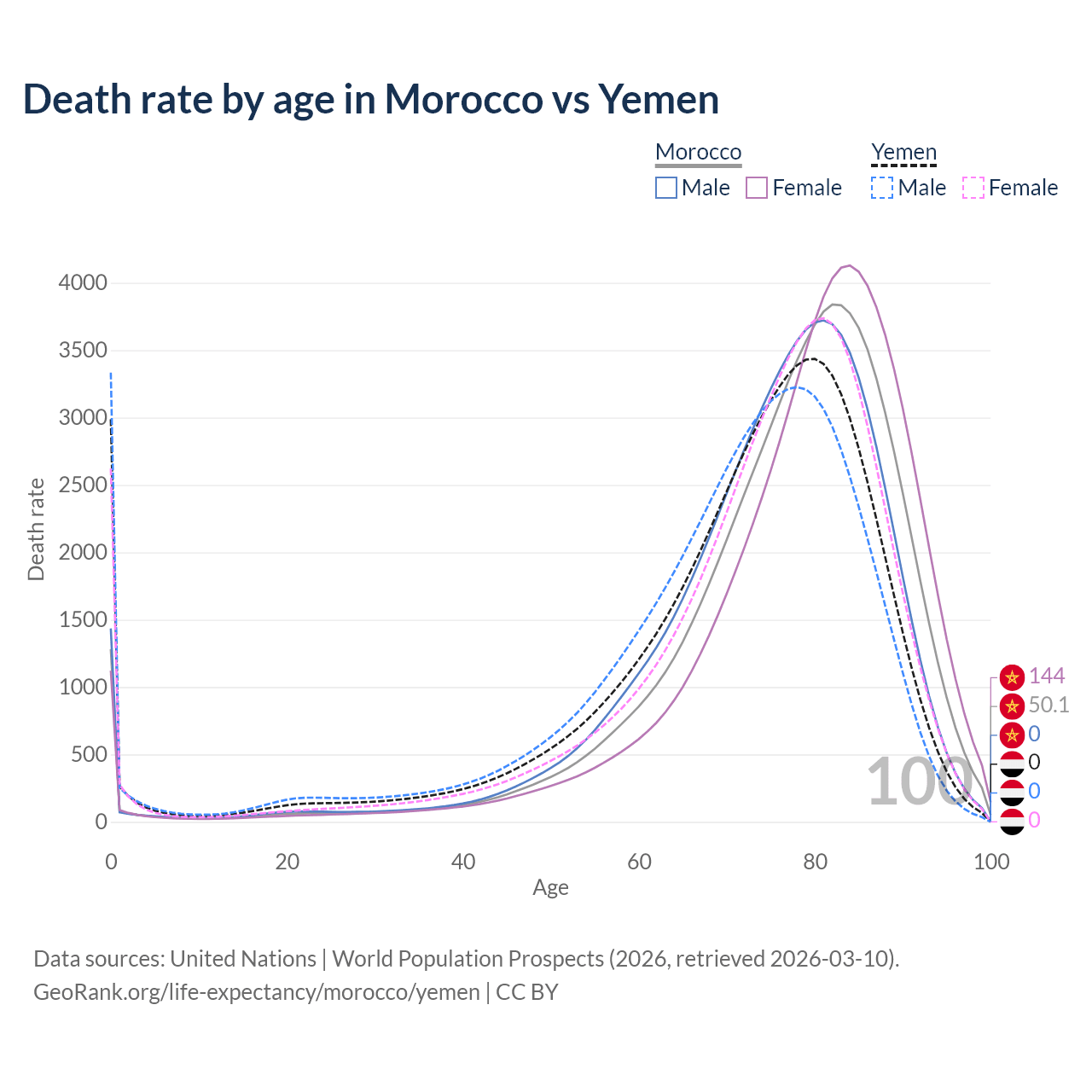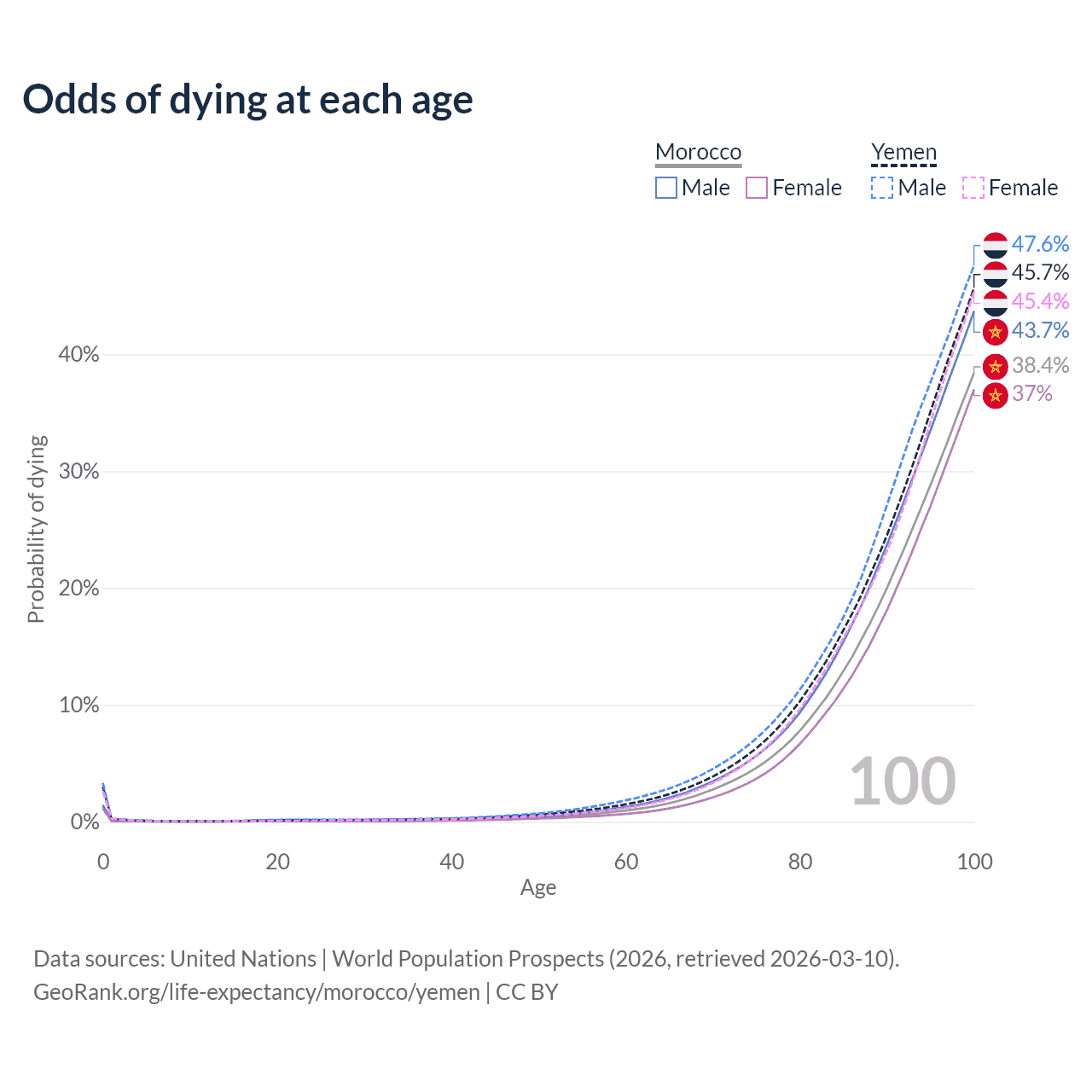 This life expectancy calculator shows the odds of living to 100, 95, 90, and below based on current age for both males and females in Morocco and Yemen, along with mean and median age of death. The calculations are based on the 2026 life tables (actuarial tables) from the UN World Population Prospects.