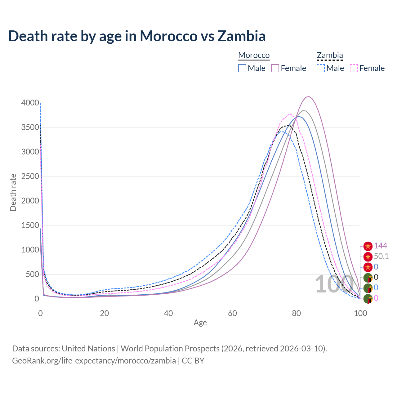 In Morocco, the most common age of death is 82, compared to 0 in Zambia. The median age of death is 79.3 in Morocco and 73.1 in Zambia, meaning only half of each cohort is expected to live past that age.