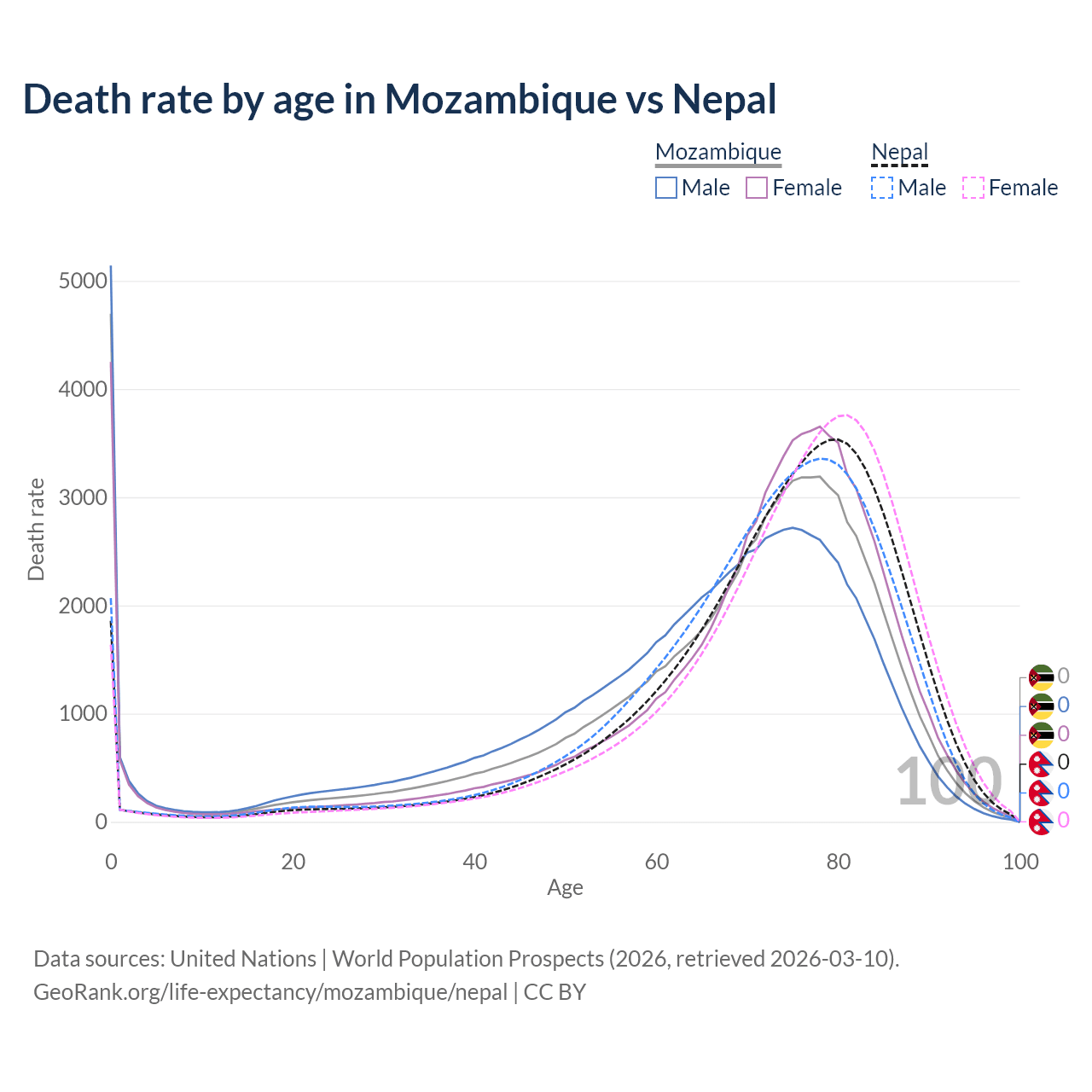 In Mozambique, the most common age of death is 0, compared to 80 in Nepal. The median age of death is 71.2 in Mozambique and 75.4 in Nepal, meaning only half of each cohort is expected to live past that age.