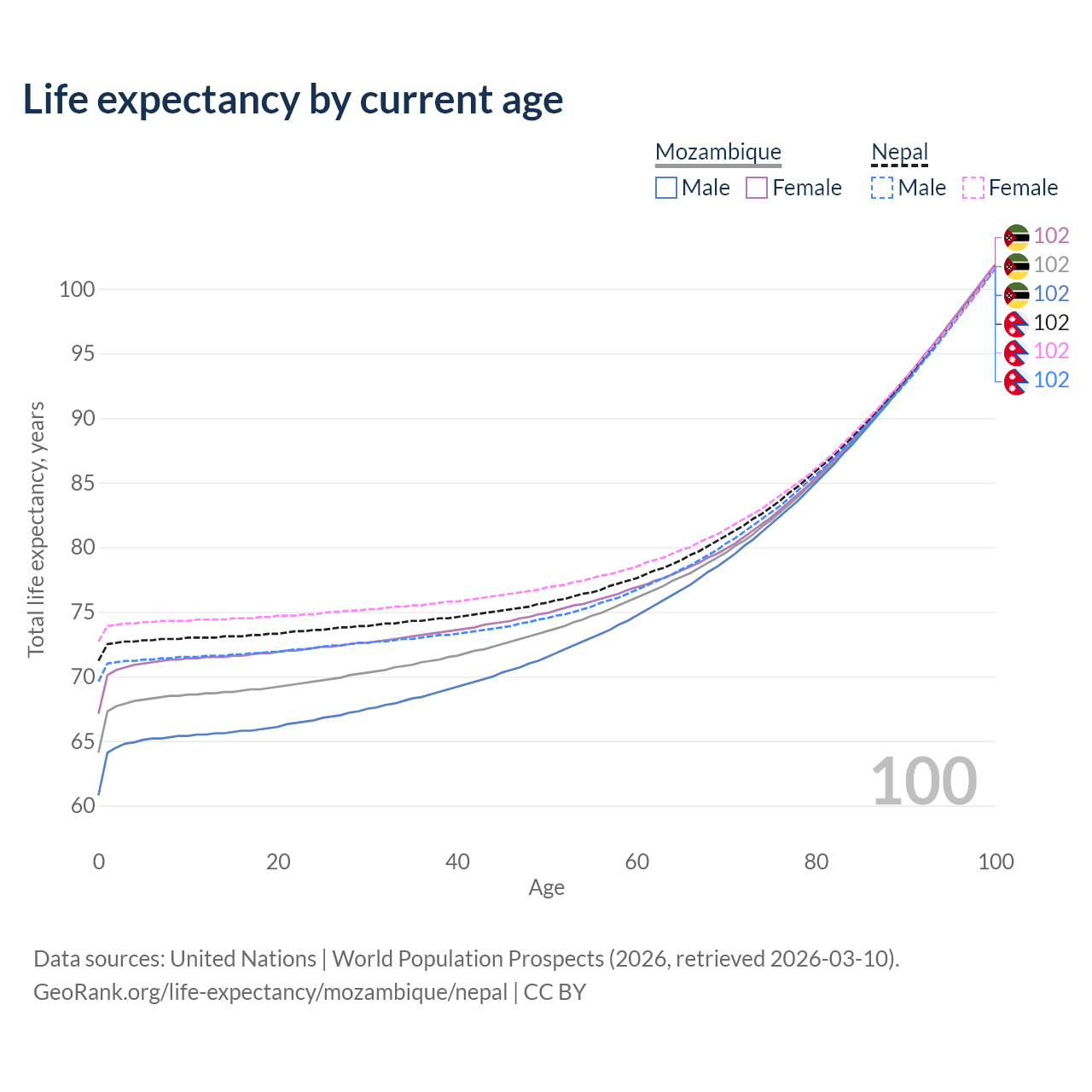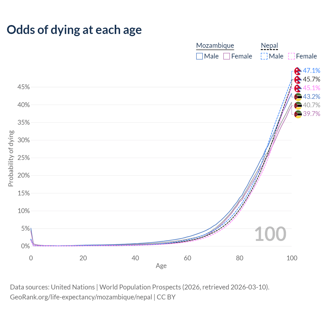 This life expectancy calculator shows the odds of living to 100, 95, 90, and below based on current age for both males and females in Mozambique and Nepal, along with mean and median age of death. The calculations are based on the 2026 life tables (actuarial tables) from the UN World Population Prospects.