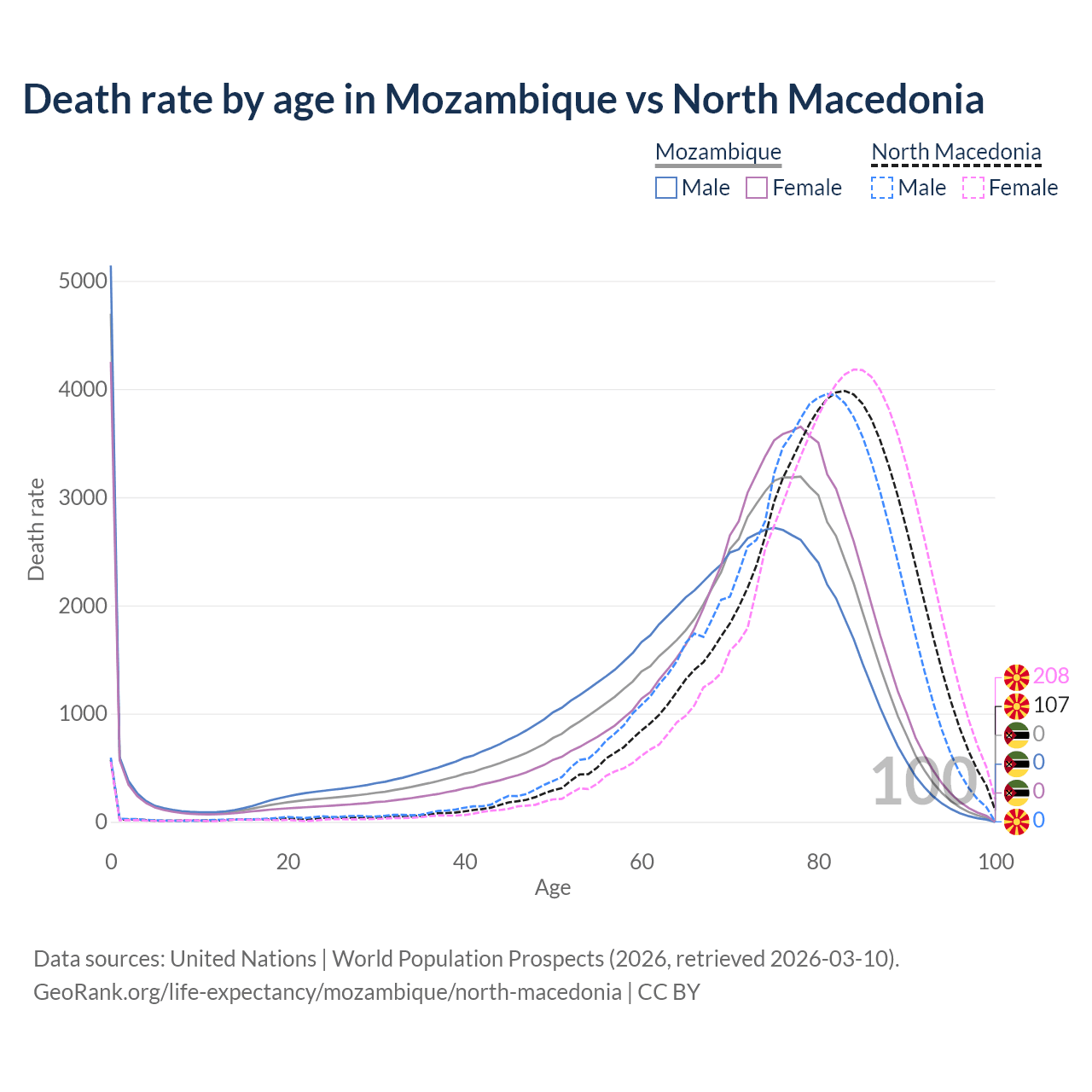 In Mozambique, the most common age of death is 0, compared to 83 in North Macedonia. The median age of death is 71.2 in Mozambique and 80.3 in North Macedonia, meaning only half of each cohort is expected to live past that age.