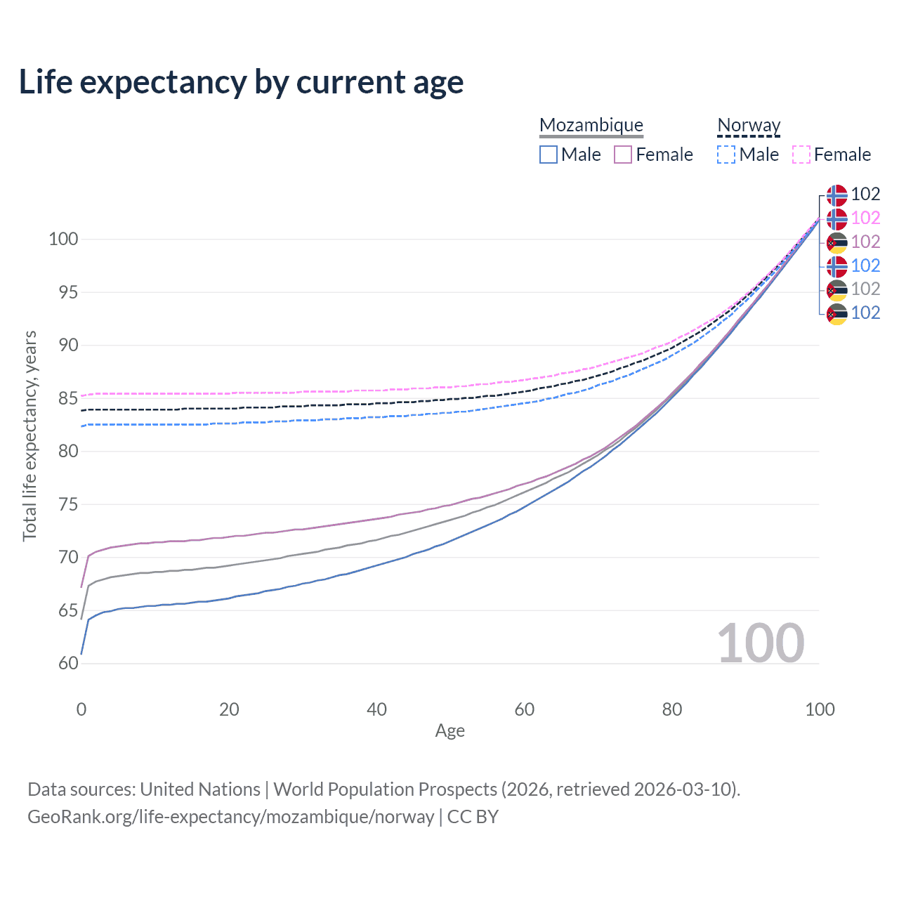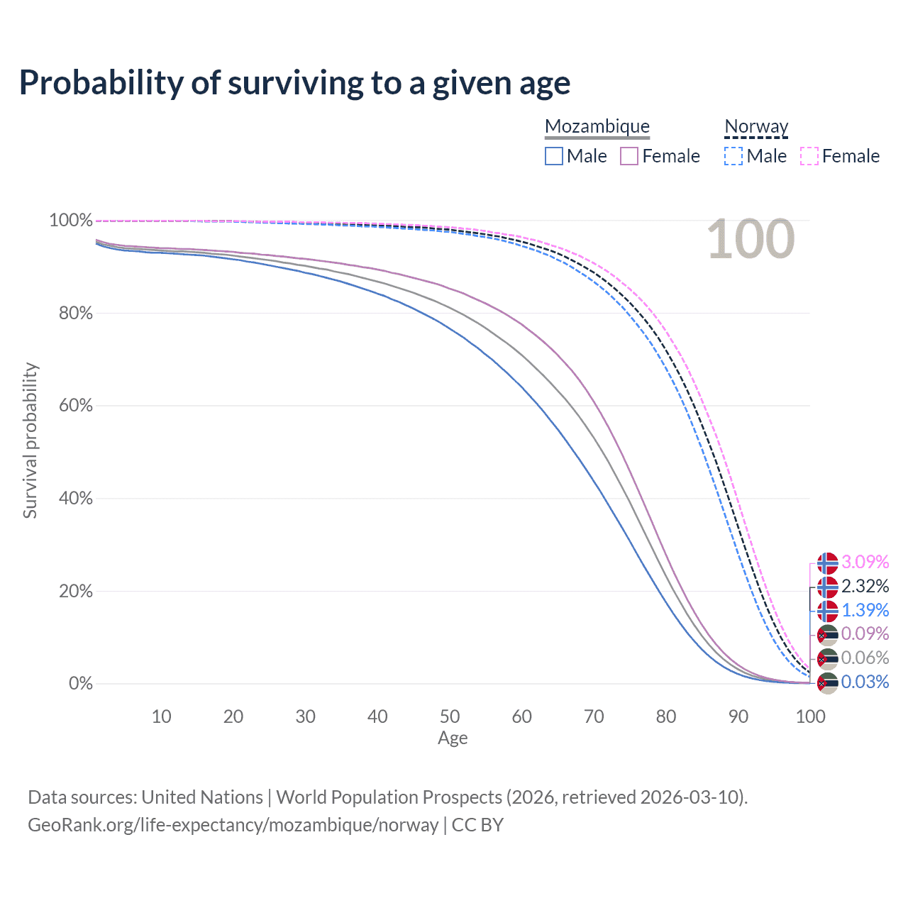 This life expectancy calculator shows the odds of living to 100, 95, 90, and below based on current age for both males and females in Mozambique and Norway, along with mean and median age of death. The calculations are based on the 2026 life tables (actuarial tables) from the UN World Population Prospects.