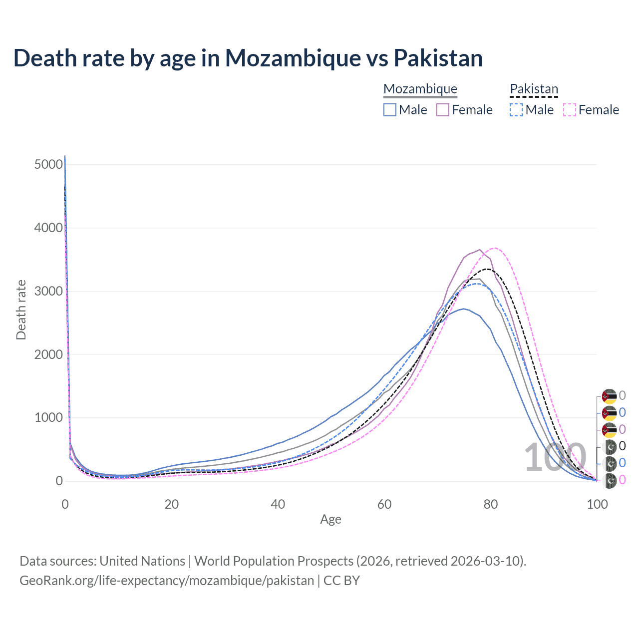 In Mozambique, the most common age of death is 0, compared to 0 in Pakistan. The median age of death is 71.2 in Mozambique and 74.3 in Pakistan, meaning only half of each cohort is expected to live past that age.