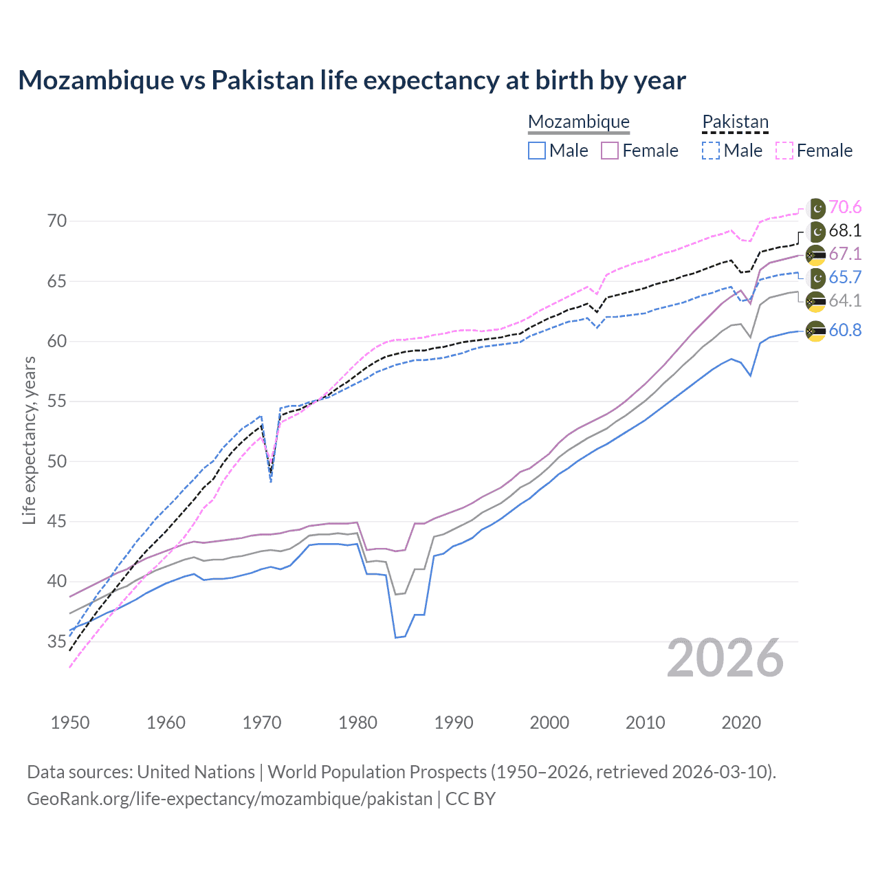 The average life expectancy at birth is 64.1 years in Mozambique vs 68.1 in Pakistan. Mozambique is ranked 178/197 by life expectancy, and Pakistan is 151/197. In Mozambique, the life expectancy is 60.8 years for males and 67.1 years for females. In Pakistan, it's 65.7 years for males and 70.6 years for females.