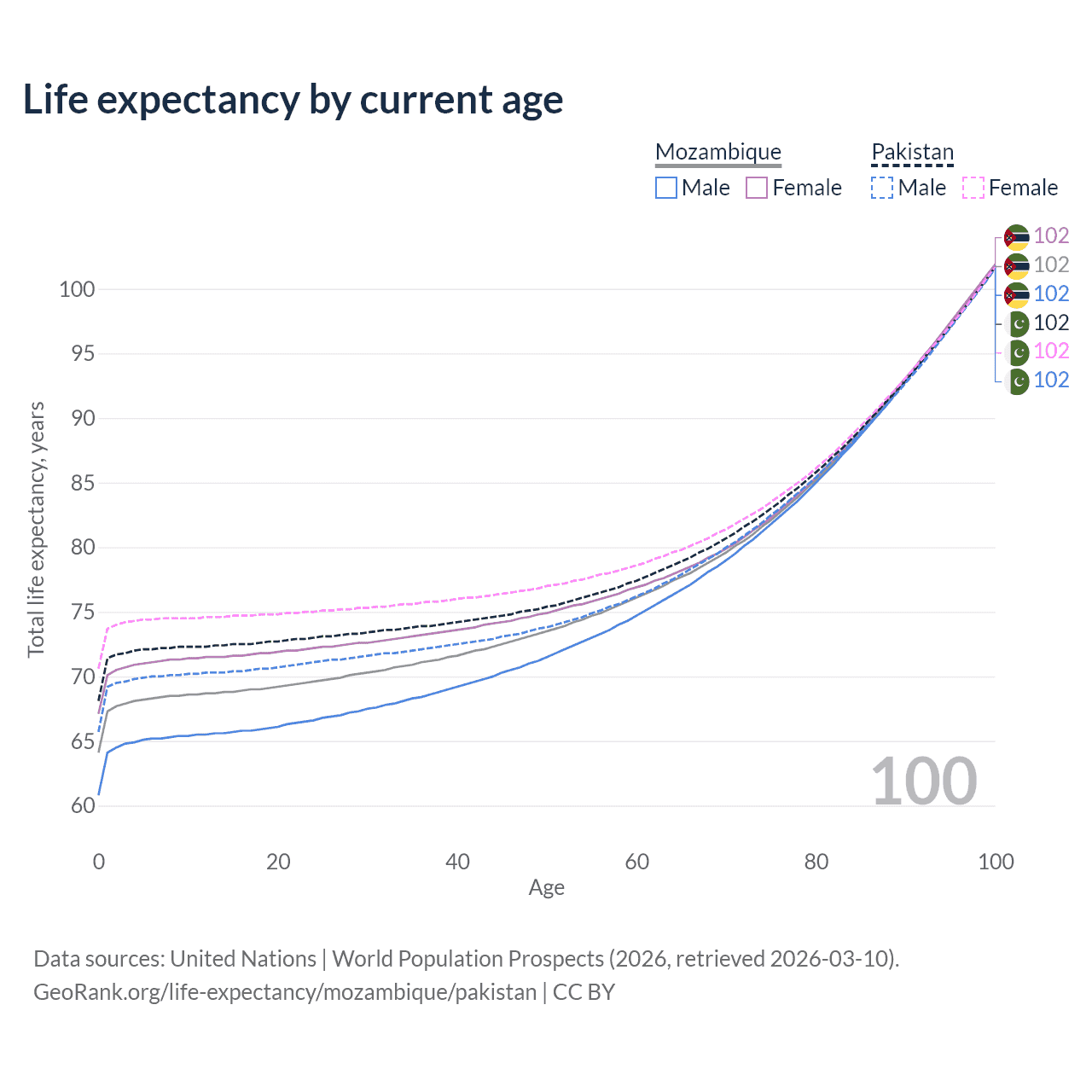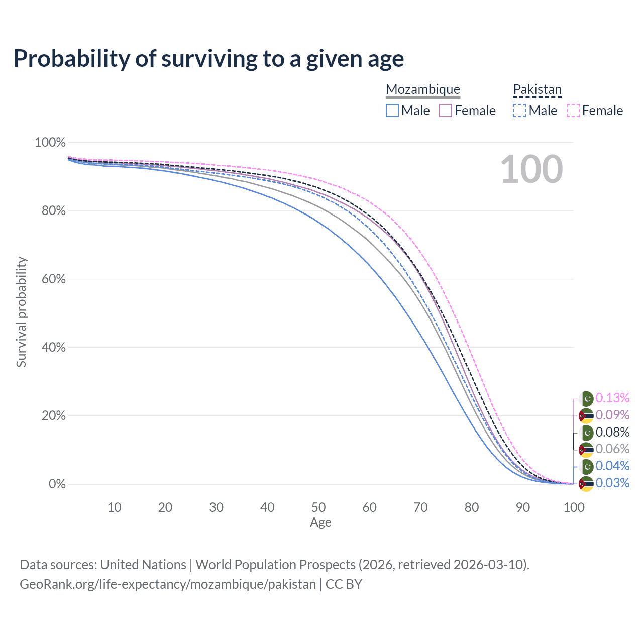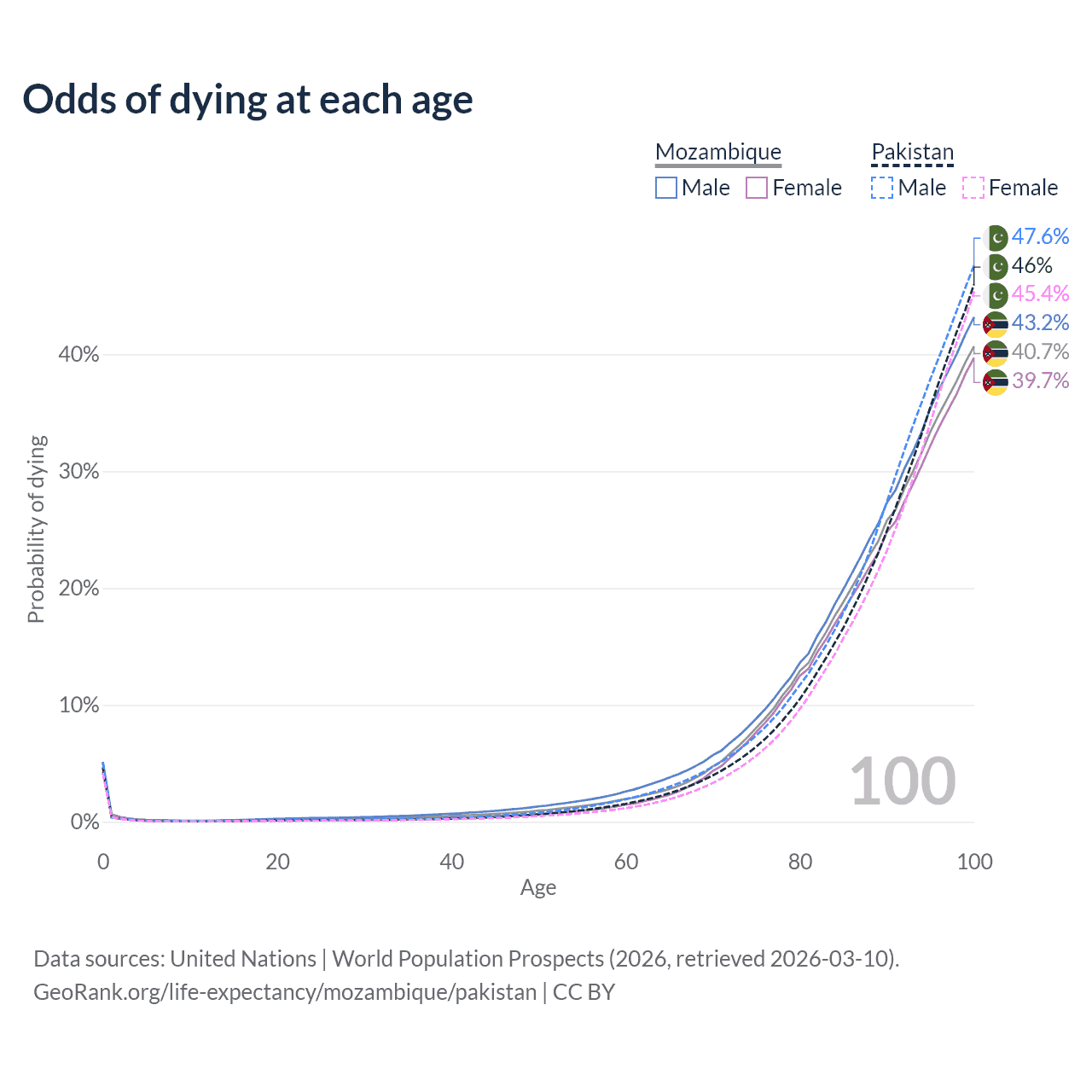 This life expectancy calculator shows the odds of living to 100, 95, 90, and below based on current age for both males and females in Mozambique and Pakistan, along with mean and median age of death. The calculations are based on the 2026 life tables (actuarial tables) from the UN World Population Prospects.