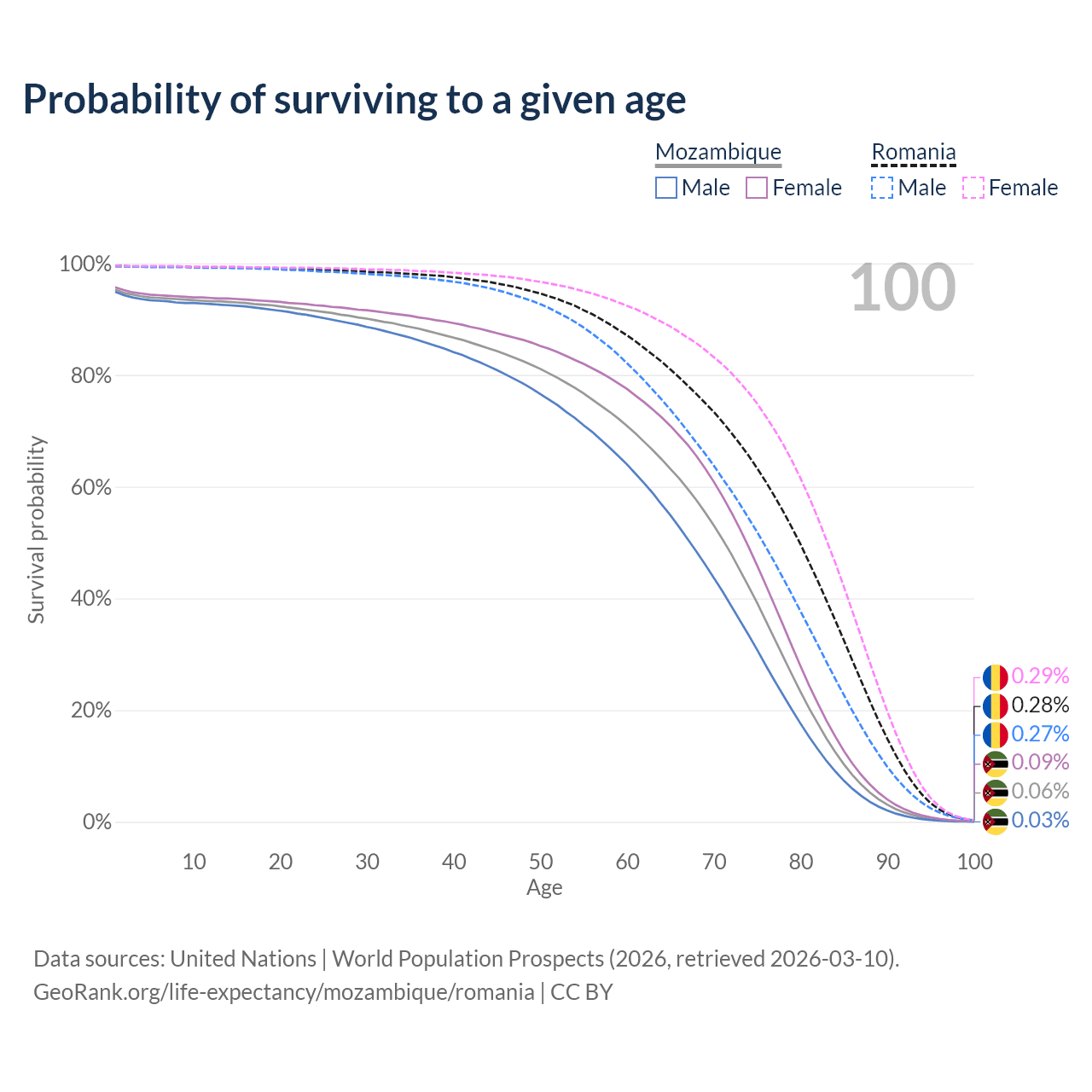 This life expectancy calculator shows the odds of living to 100, 95, 90, and below based on current age for both males and females in Mozambique and Romania, along with mean and median age of death. The calculations are based on the 2026 life tables (actuarial tables) from the UN World Population Prospects.