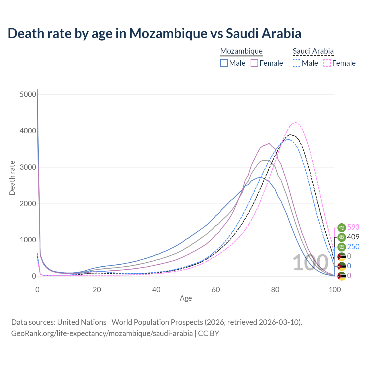 In Mozambique, the most common age of death is 0, compared to 85 in Saudi Arabia. The median age of death is 71.2 in Mozambique and 82.5 in Saudi Arabia, meaning only half of each cohort is expected to live past that age.