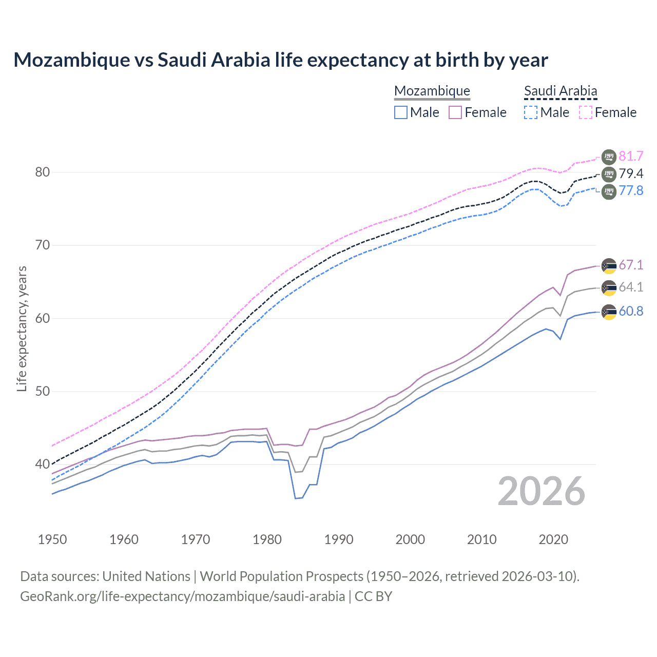 The average life expectancy at birth is 64.1 years in Mozambique vs 79.4 in Saudi Arabia. Mozambique is ranked 178/197 by life expectancy, and Saudi Arabia is 49/197. In Mozambique, the life expectancy is 60.8 years for males and 67.1 years for females. In Saudi Arabia, it's 77.8 years for males and 81.7 years for females.