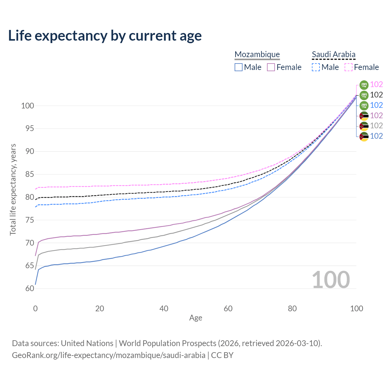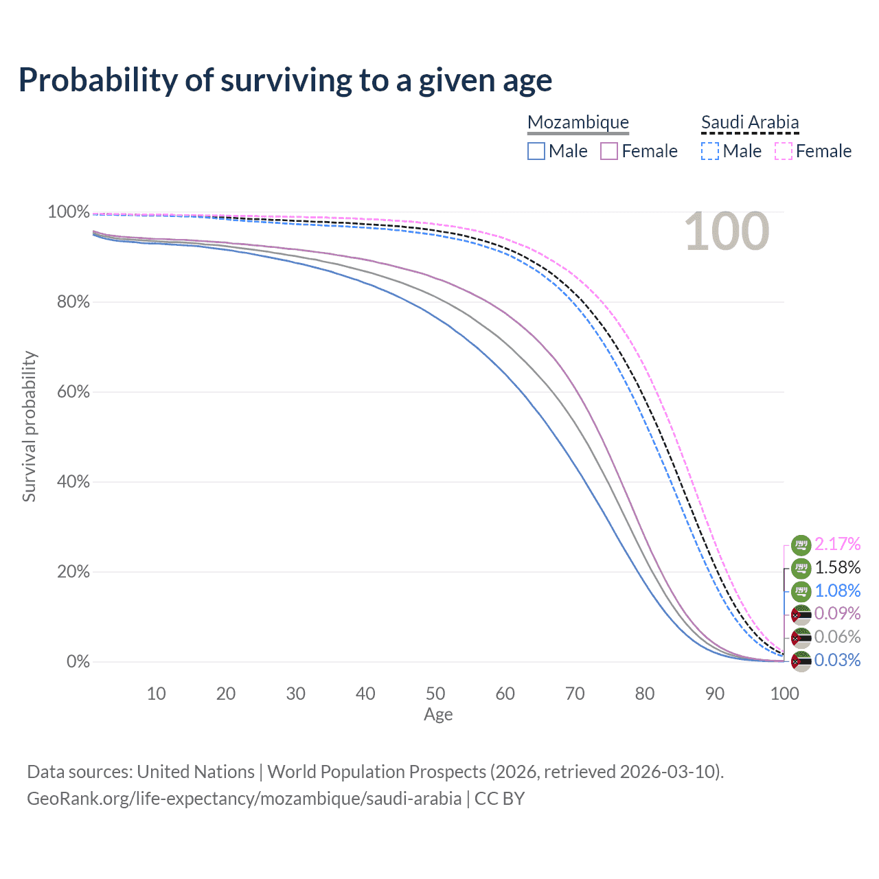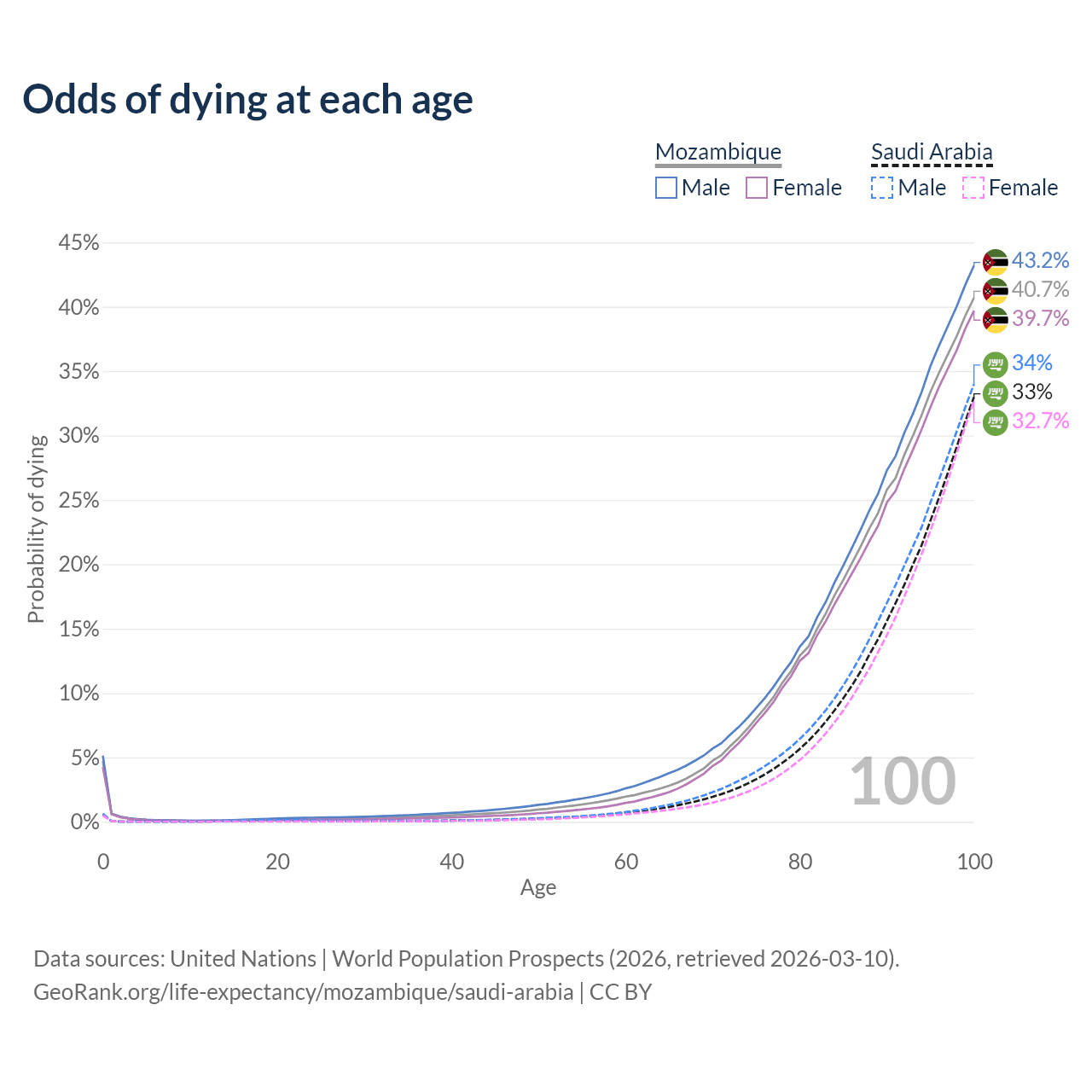 This life expectancy calculator shows the odds of living to 100, 95, 90, and below based on current age for both males and females in Mozambique and Saudi Arabia, along with mean and median age of death. The calculations are based on the 2026 life tables (actuarial tables) from the UN World Population Prospects.