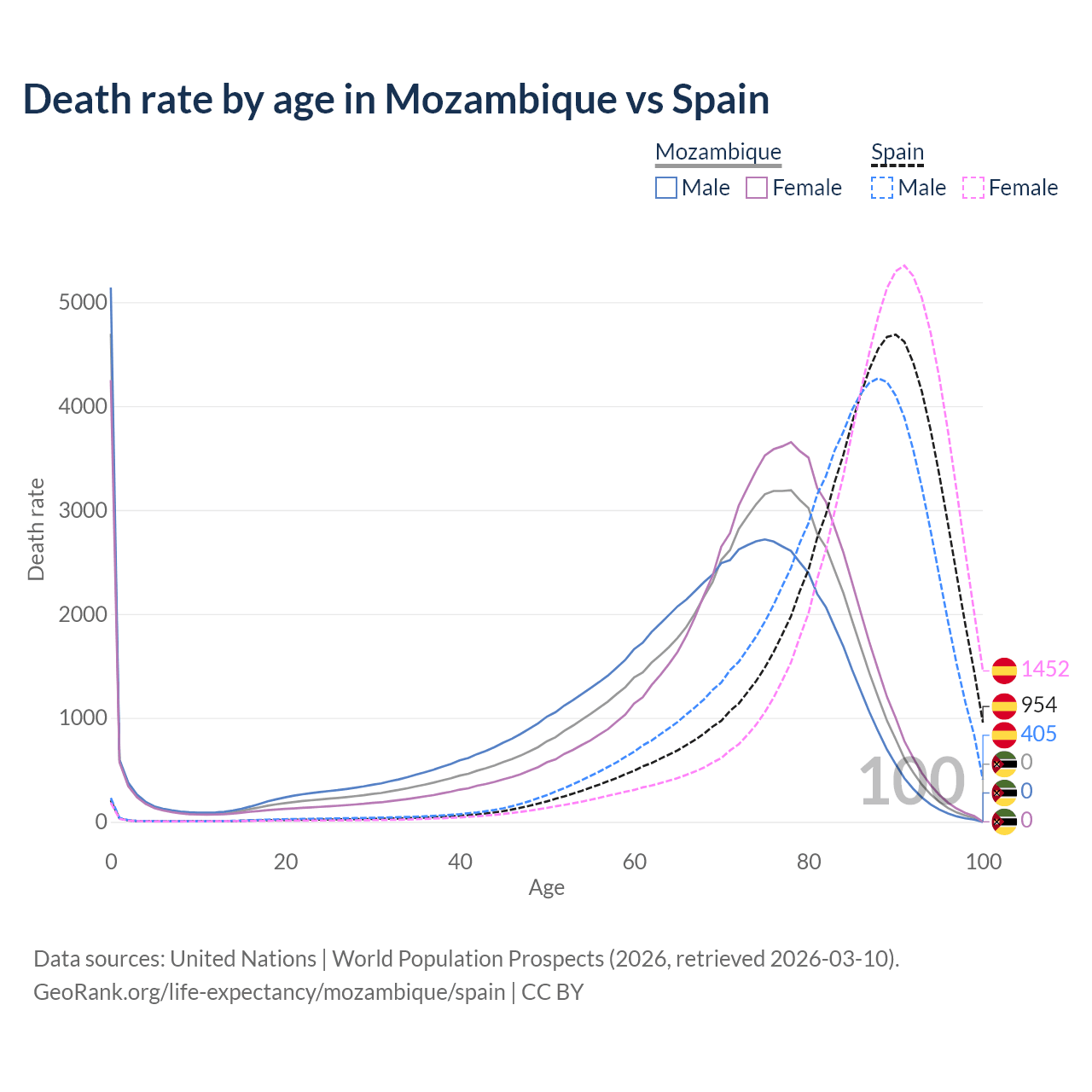 In Mozambique, the most common age of death is 0, compared to 90 in Spain. The median age of death is 71.2 in Mozambique and 87 in Spain, meaning only half of each cohort is expected to live past that age.