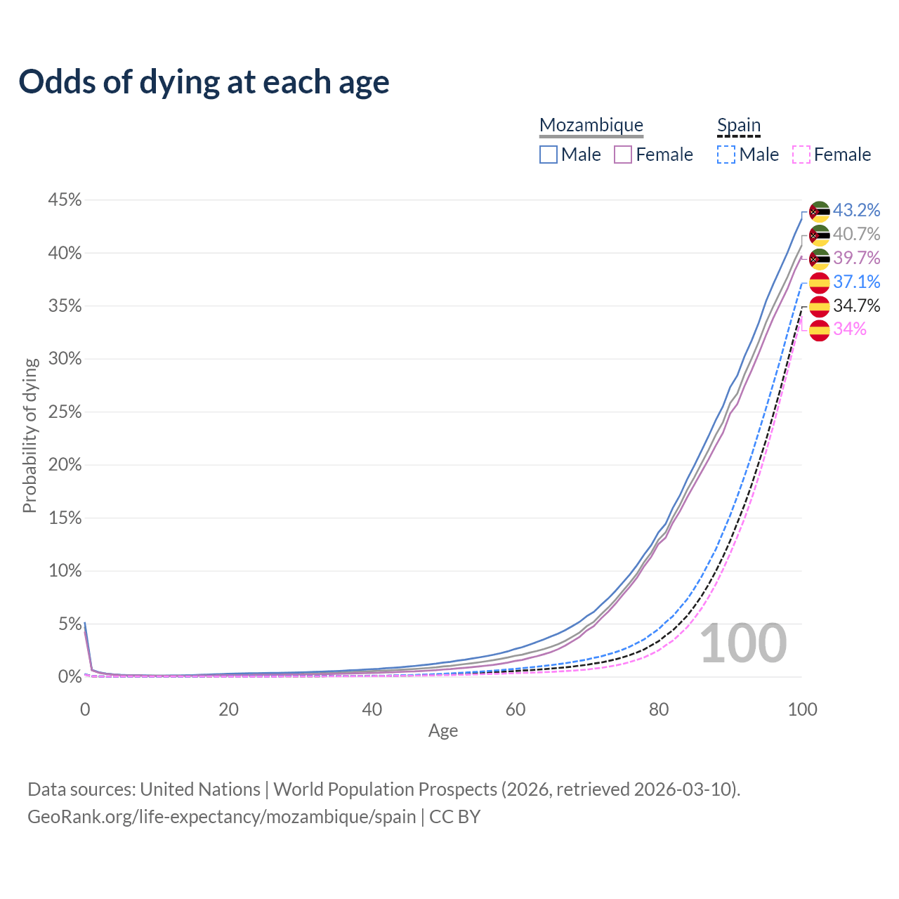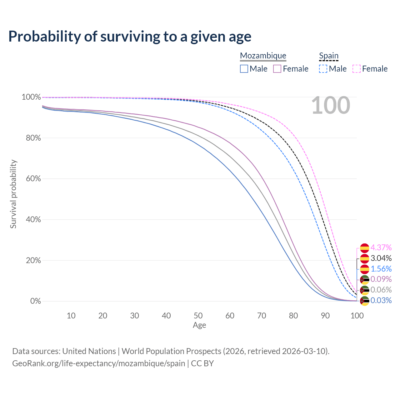 This life expectancy calculator shows the odds of living to 100, 95, 90, and below based on current age for both males and females in Mozambique and Spain, along with mean and median age of death. The calculations are based on the 2026 life tables (actuarial tables) from the UN World Population Prospects.