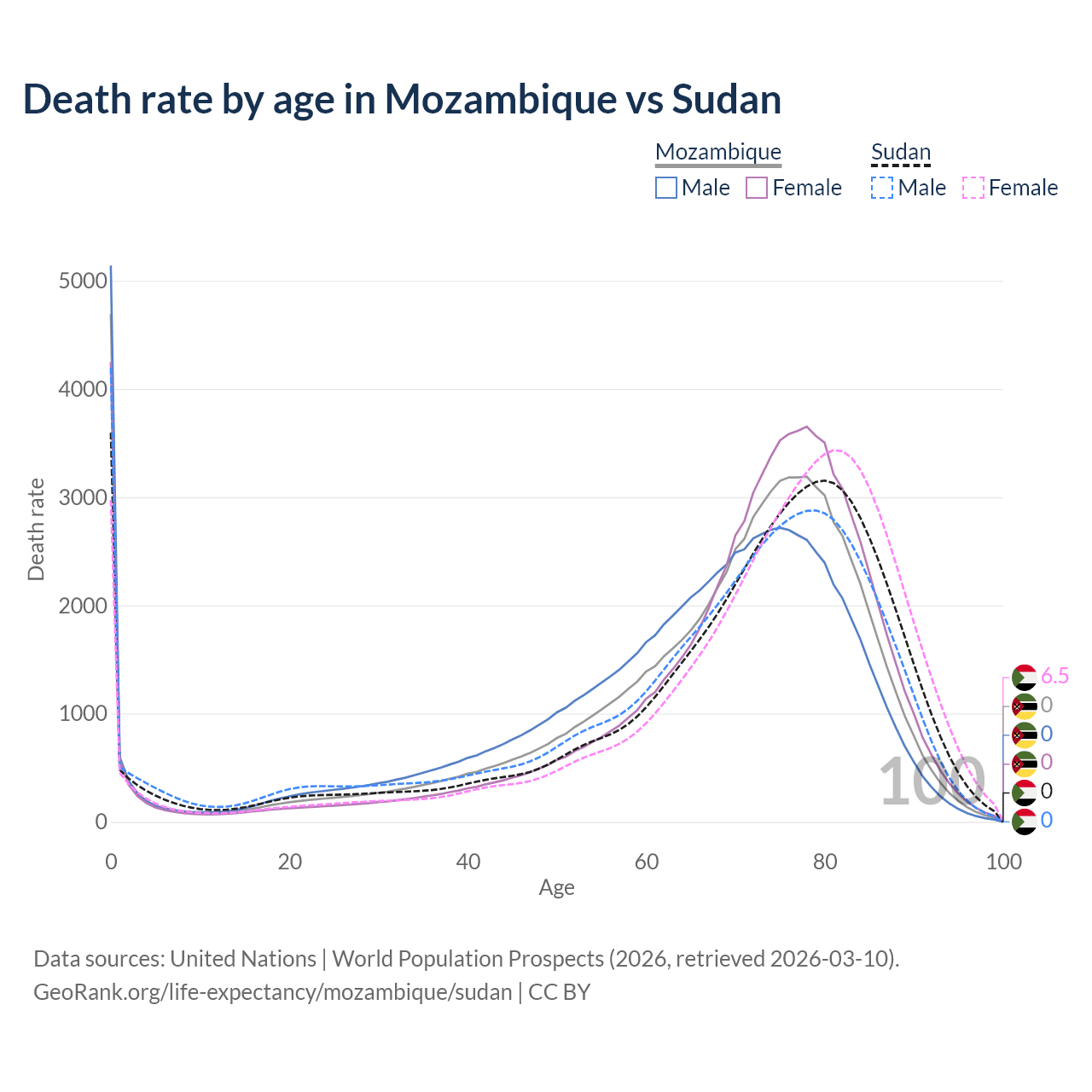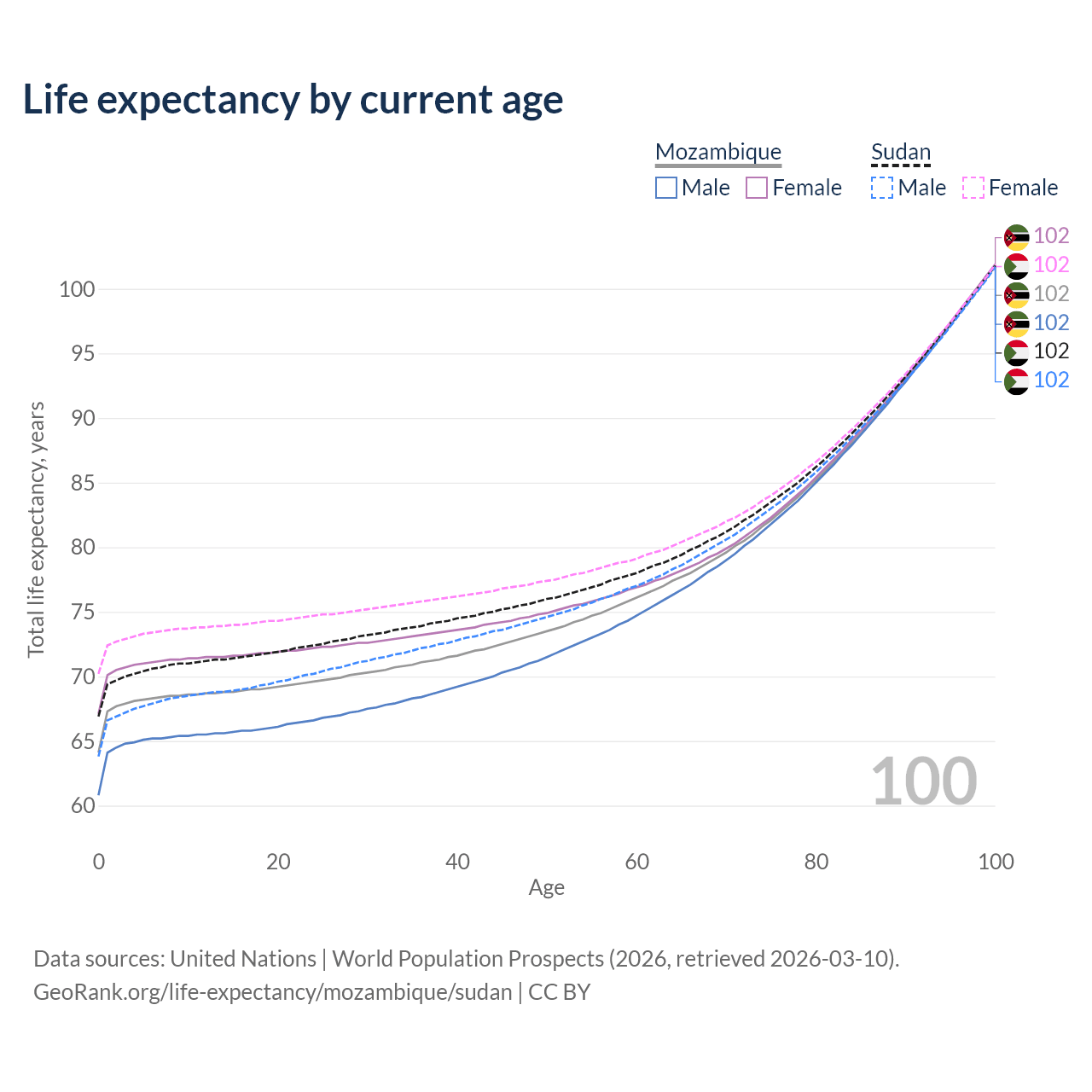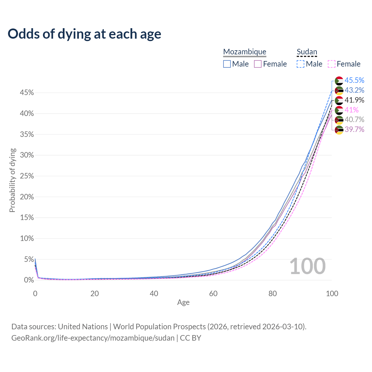 This life expectancy calculator shows the odds of living to 100, 95, 90, and below based on current age for both males and females in Mozambique and Sudan, along with mean and median age of death. The calculations are based on the 2026 life tables (actuarial tables) from the UN World Population Prospects.
