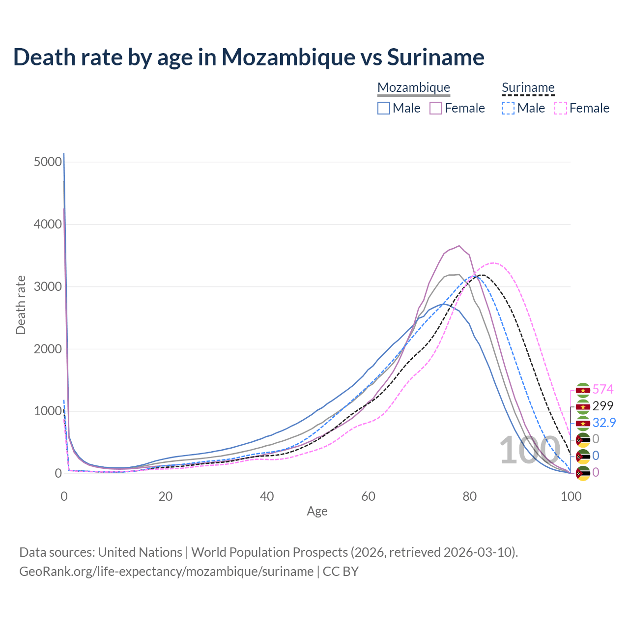 In Mozambique, the most common age of death is 0, compared to 82 in Suriname. The median age of death is 71.2 in Mozambique and 78 in Suriname, meaning only half of each cohort is expected to live past that age.