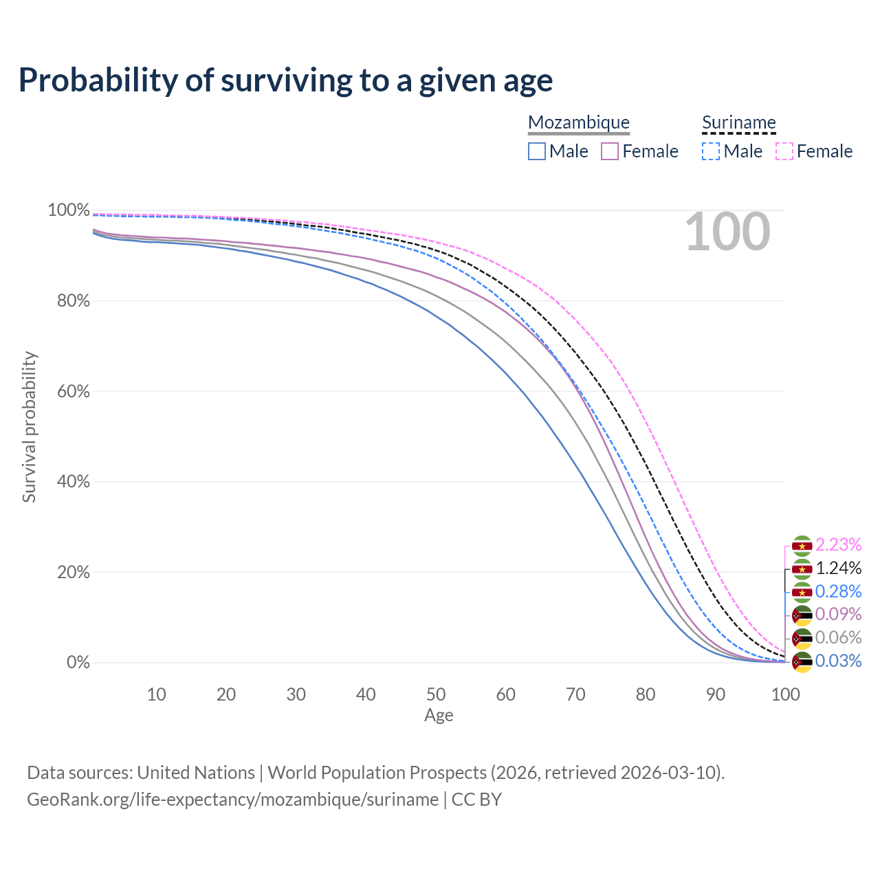 This life expectancy calculator shows the odds of living to 100, 95, 90, and below based on current age for both males and females in Mozambique and Suriname, along with mean and median age of death. The calculations are based on the 2026 life tables (actuarial tables) from the UN World Population Prospects.