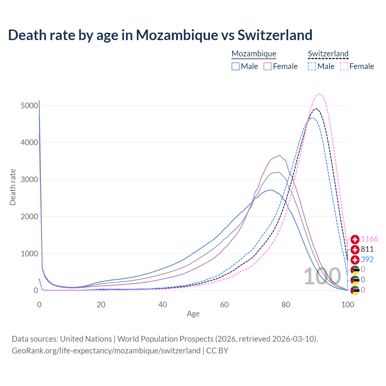 In Mozambique, the most common age of death is 0, compared to 90 in Switzerland. The median age of death is 71.2 in Mozambique and 87.2 in Switzerland, meaning only half of each cohort is expected to live past that age.
