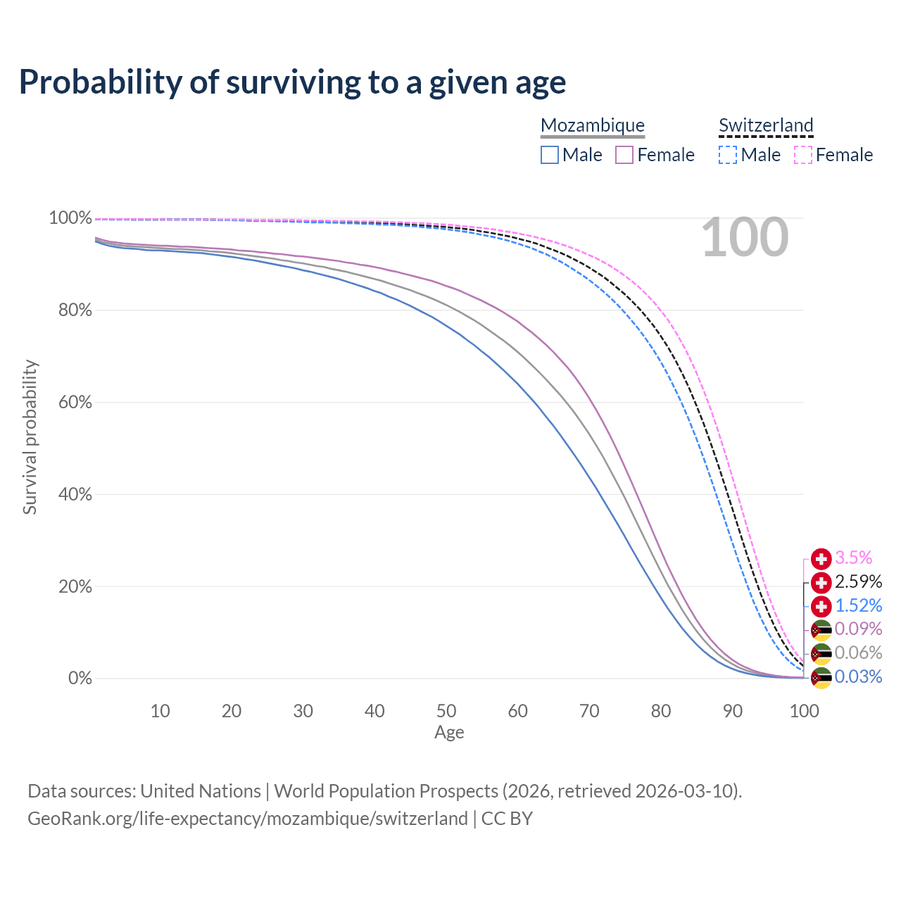 This life expectancy calculator shows the odds of living to 100, 95, 90, and below based on current age for both males and females in Mozambique and Switzerland, along with mean and median age of death. The calculations are based on the 2026 life tables (actuarial tables) from the UN World Population Prospects.