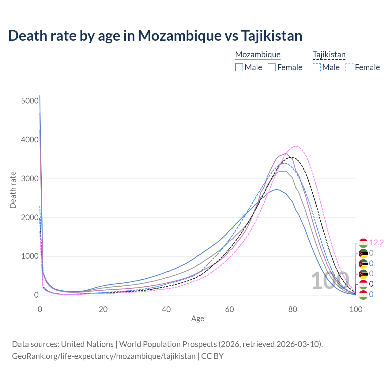 In Mozambique, the most common age of death is 0, compared to 80 in Tajikistan. The median age of death is 71.2 in Mozambique and 76 in Tajikistan, meaning only half of each cohort is expected to live past that age.