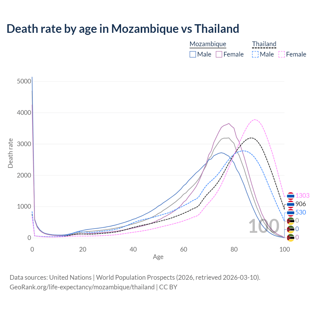 In Mozambique, the most common age of death is 0, compared to 87 in Thailand. The median age of death is 71.2 in Mozambique and 81.8 in Thailand, meaning only half of each cohort is expected to live past that age.
