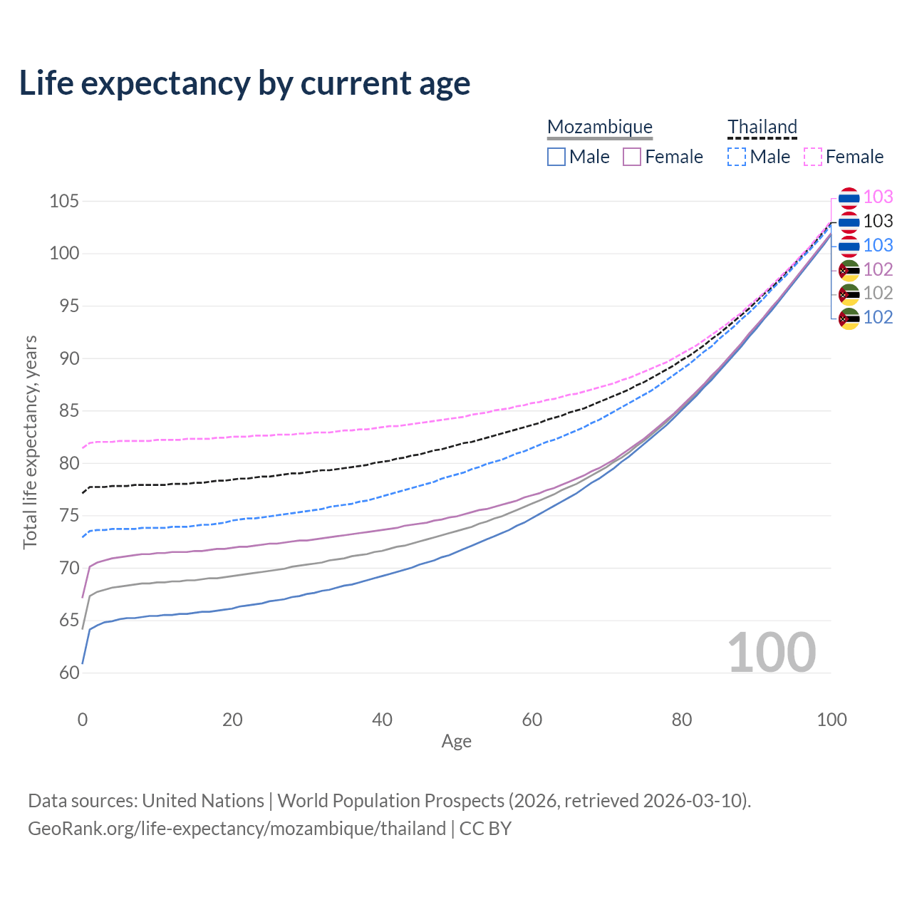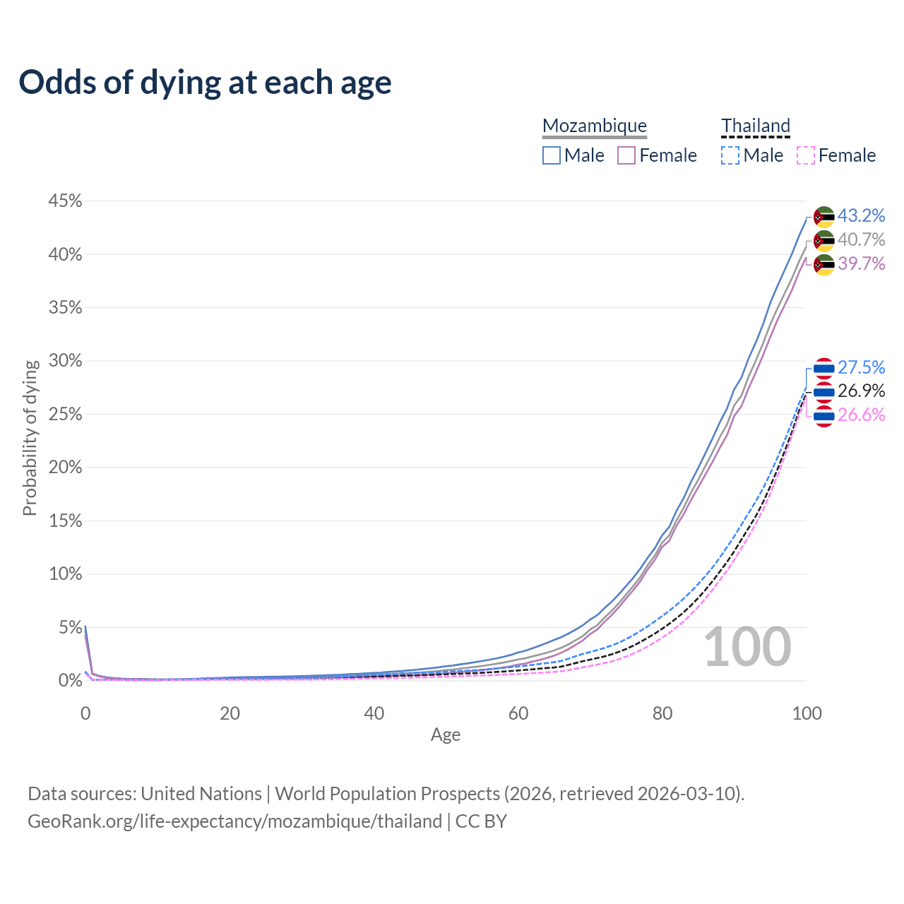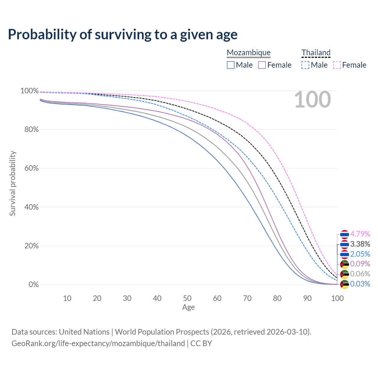 This life expectancy calculator shows the odds of living to 100, 95, 90, and below based on current age for both males and females in Mozambique and Thailand, along with mean and median age of death. The calculations are based on the 2026 life tables (actuarial tables) from the UN World Population Prospects.