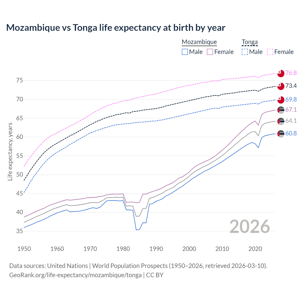 The average life expectancy at birth is 64.1 years in Mozambique vs 73.4 in Tonga. Mozambique is ranked 178/197 by life expectancy, and Tonga is 109/197. In Mozambique, the life expectancy is 60.8 years for males and 67.1 years for females. In Tonga, it's 69.8 years for males and 76.8 years for females.