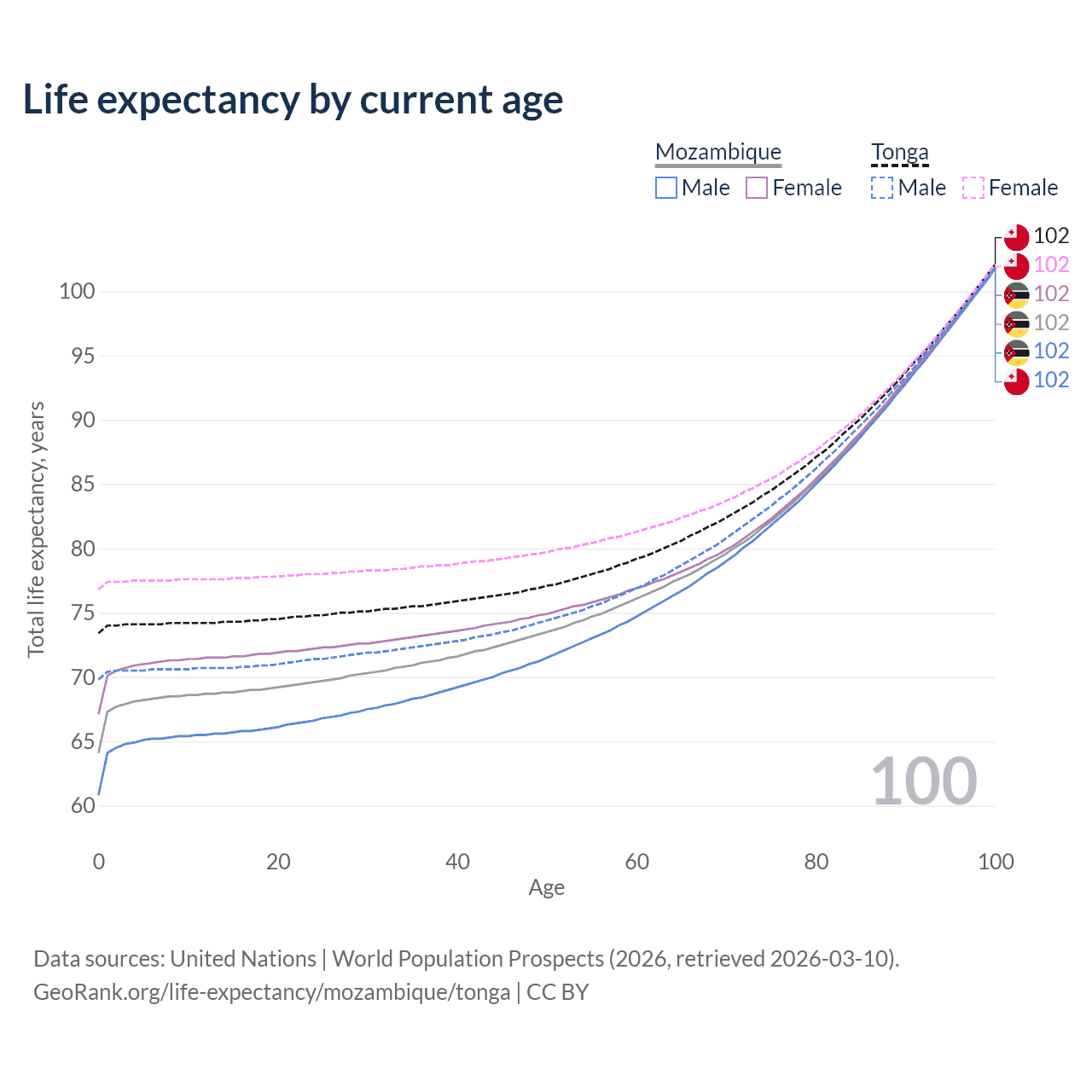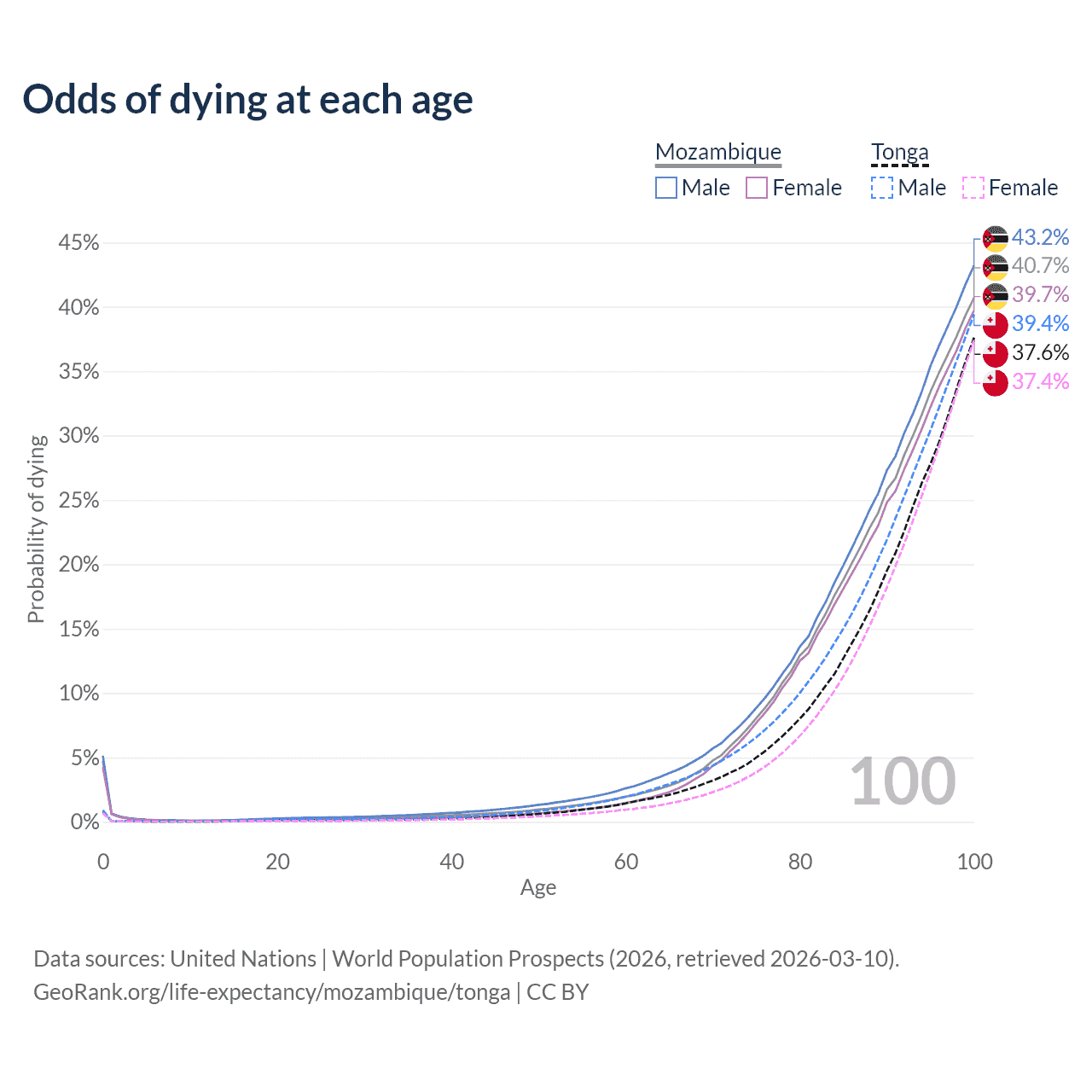 This life expectancy calculator shows the odds of living to 100, 95, 90, and below based on current age for both males and females in Mozambique and Tonga, along with mean and median age of death. The calculations are based on the 2026 life tables (actuarial tables) from the UN World Population Prospects.