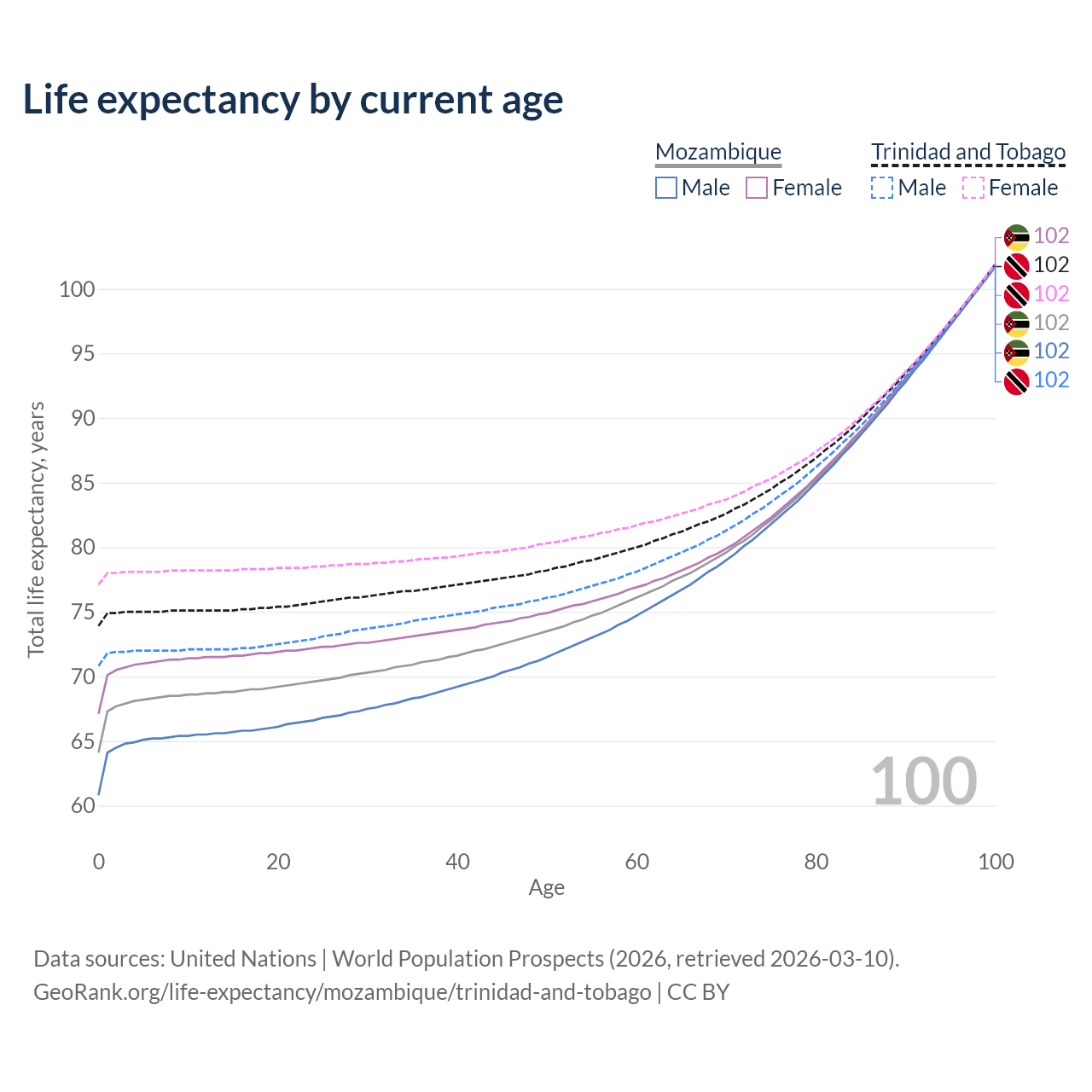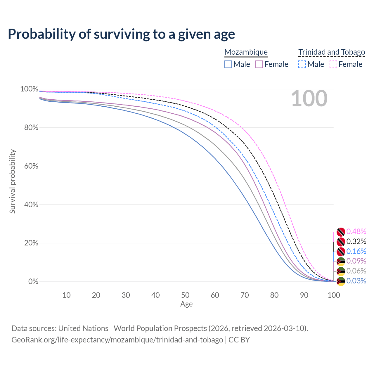 This life expectancy calculator shows the odds of living to 100, 95, 90, and below based on current age for both males and females in Mozambique and Trinidad and Tobago, along with mean and median age of death. The calculations are based on the 2026 life tables (actuarial tables) from the UN World Population Prospects.