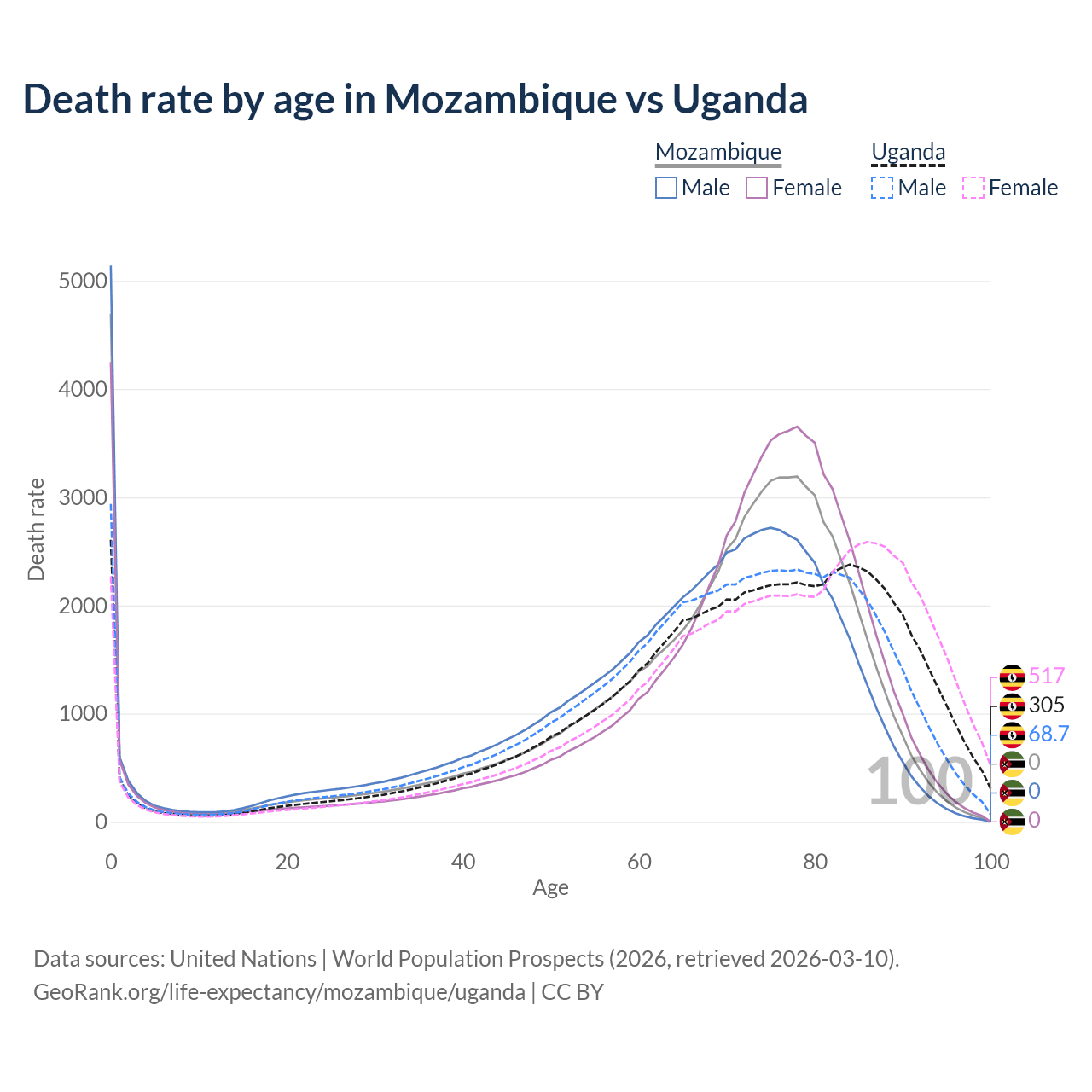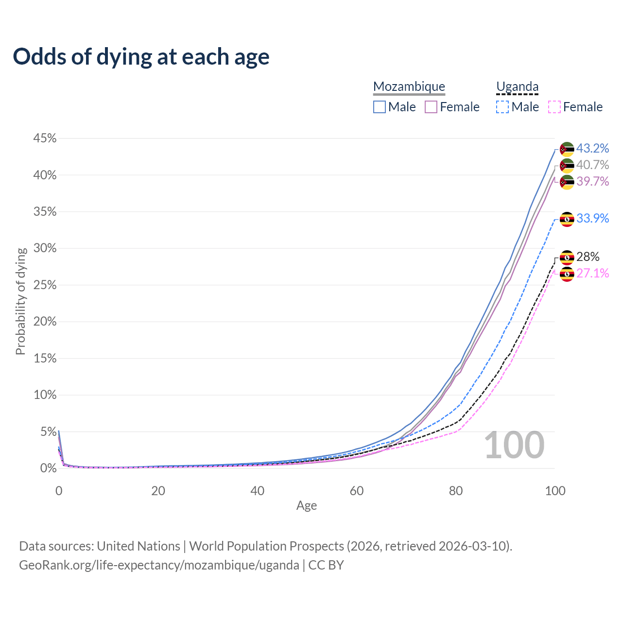 This life expectancy calculator shows the odds of living to 100, 95, 90, and below based on current age for both males and females in Mozambique and Uganda, along with mean and median age of death. The calculations are based on the 2026 life tables (actuarial tables) from the UN World Population Prospects.
