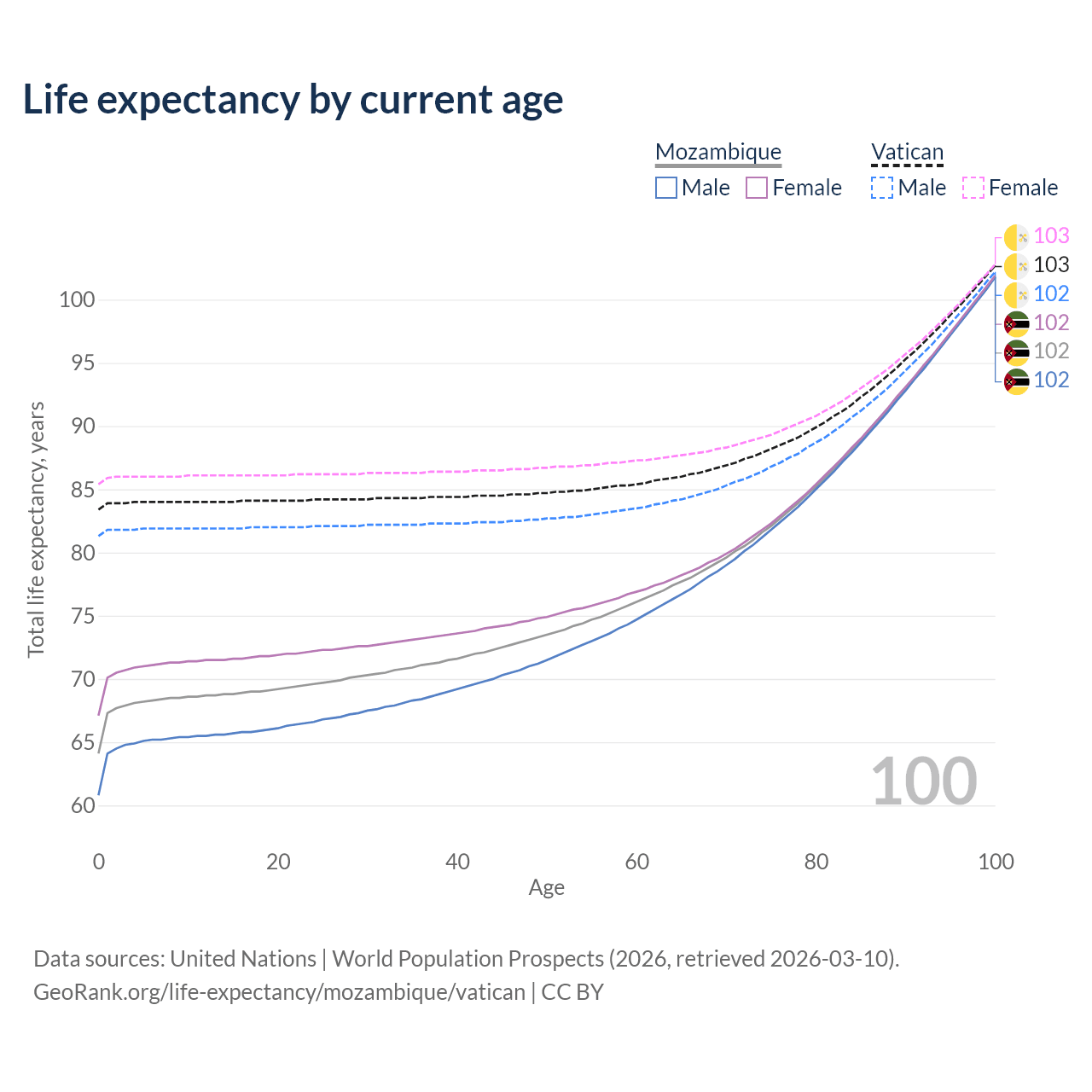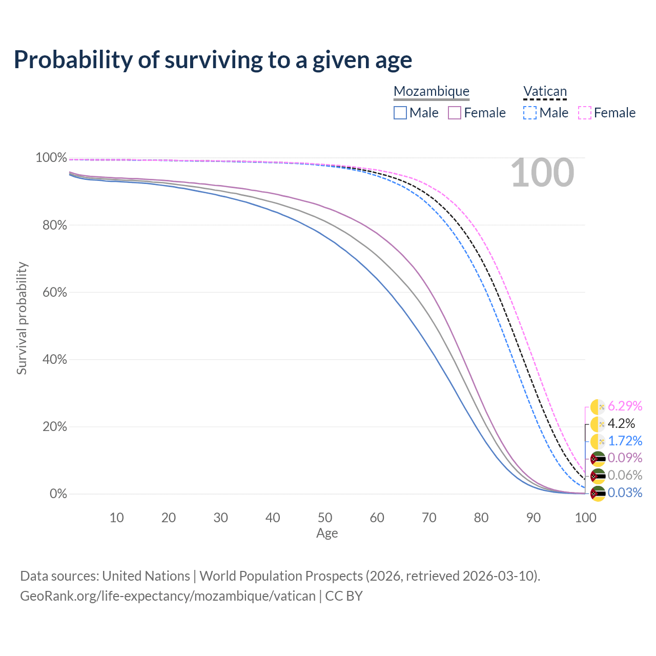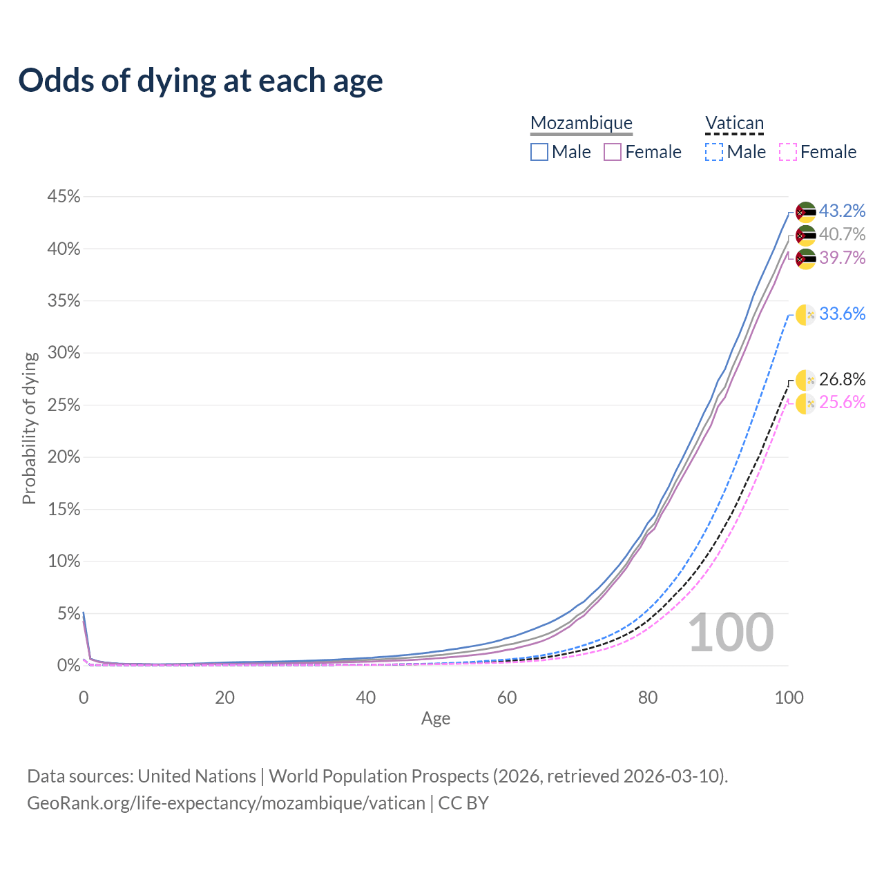 This life expectancy calculator shows the odds of living to 100, 95, 90, and below based on current age for both males and females in Mozambique and the Vatican, along with mean and median age of death. The calculations are based on the 2026 life tables (actuarial tables) from the UN World Population Prospects.