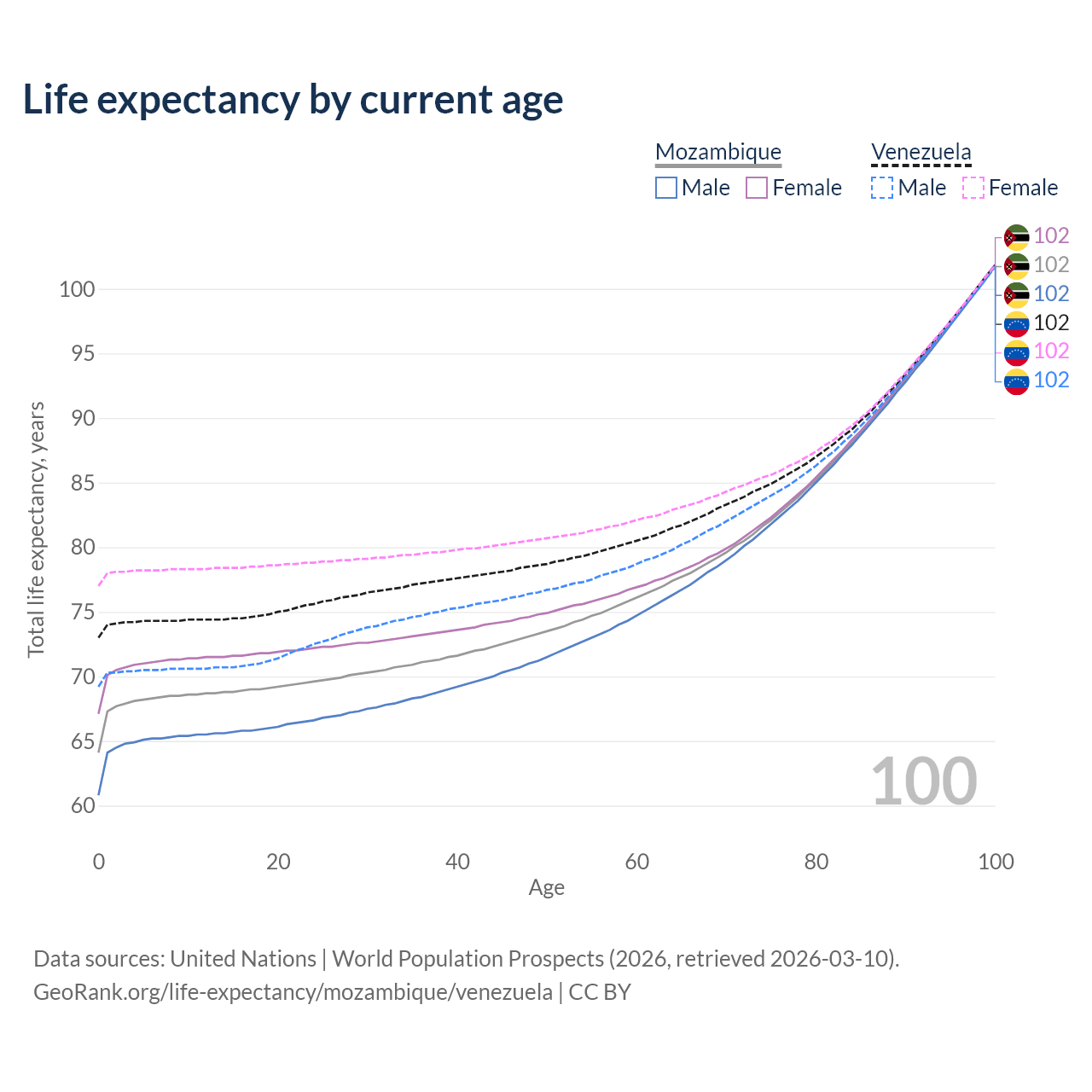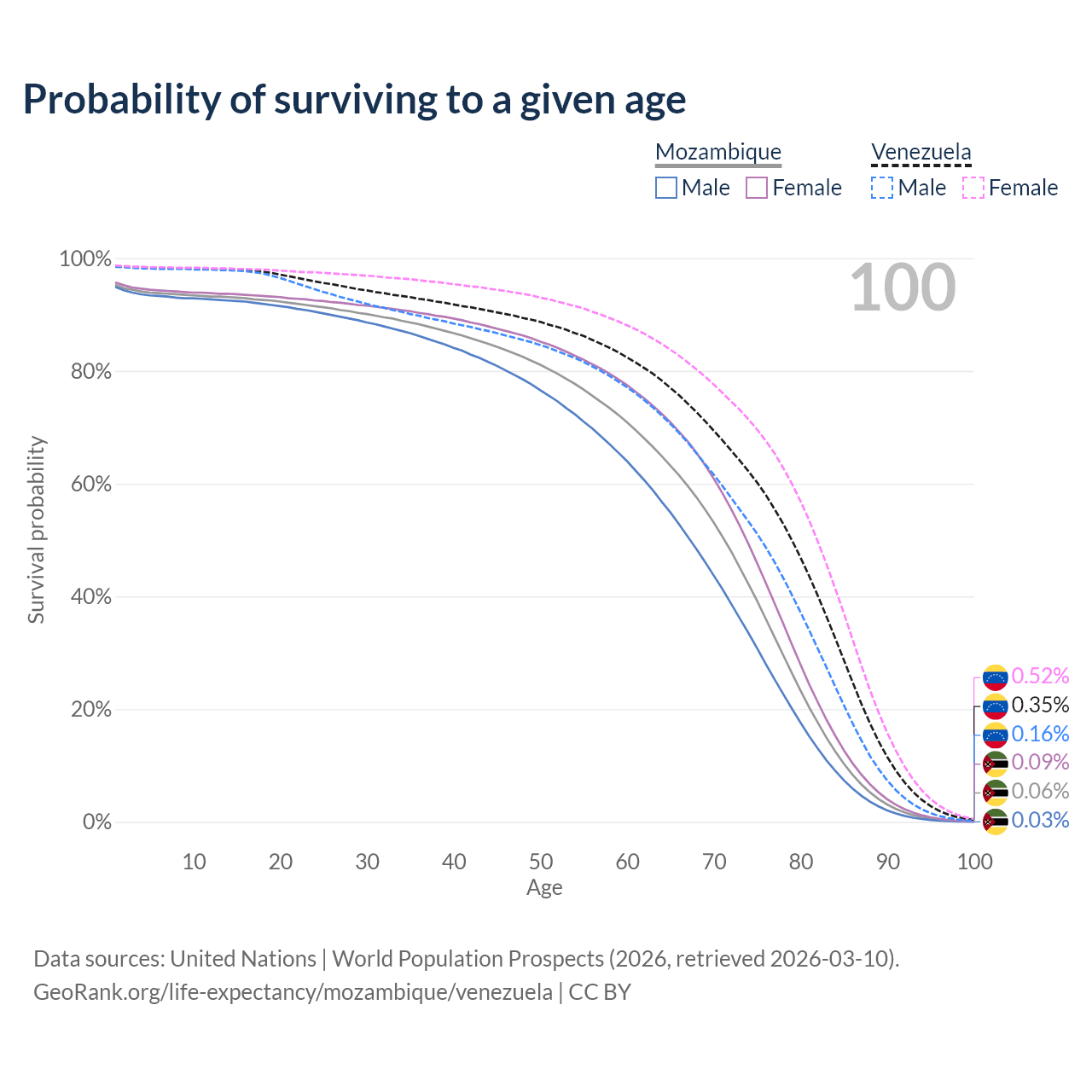 This life expectancy calculator shows the odds of living to 100, 95, 90, and below based on current age for both males and females in Mozambique and Venezuela, along with mean and median age of death. The calculations are based on the 2026 life tables (actuarial tables) from the UN World Population Prospects.