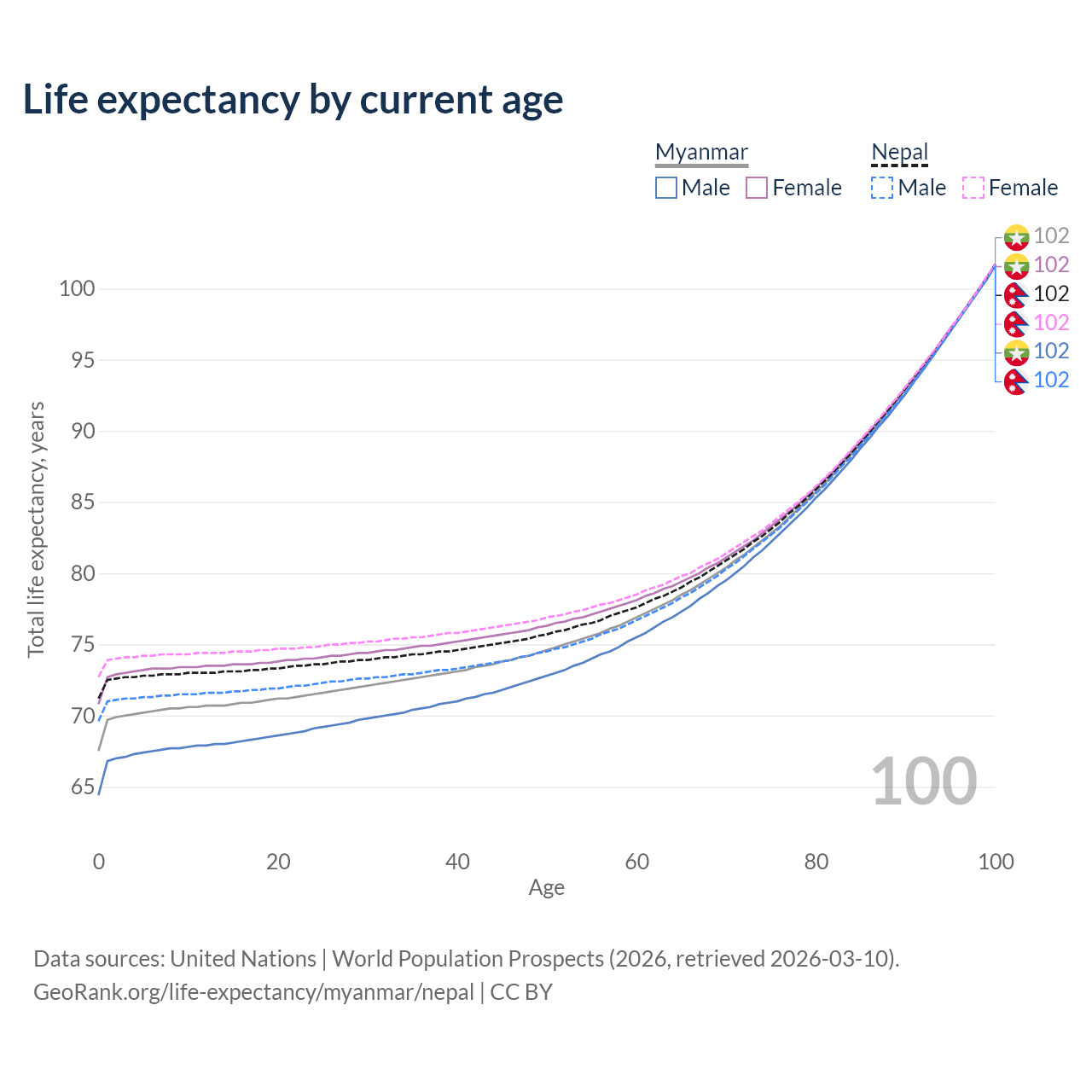This life expectancy calculator shows the odds of living to 100, 95, 90, and below based on current age for both males and females in Myanmar and Nepal, along with mean and median age of death. The calculations are based on the 2026 life tables (actuarial tables) from the UN World Population Prospects.