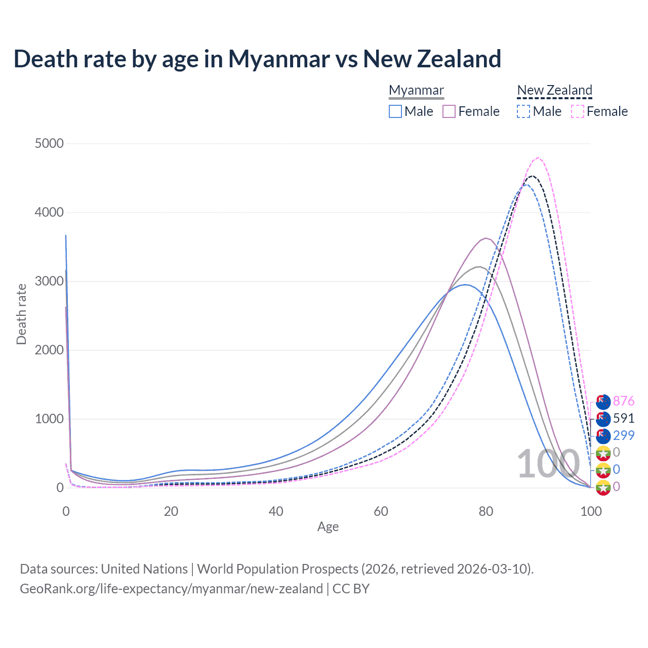 In Myanmar, the most common age of death is 79, compared to 89 in New Zealand. The median age of death is 73.1 in Myanmar and 85.8 in New Zealand, meaning only half of each cohort is expected to live past that age.