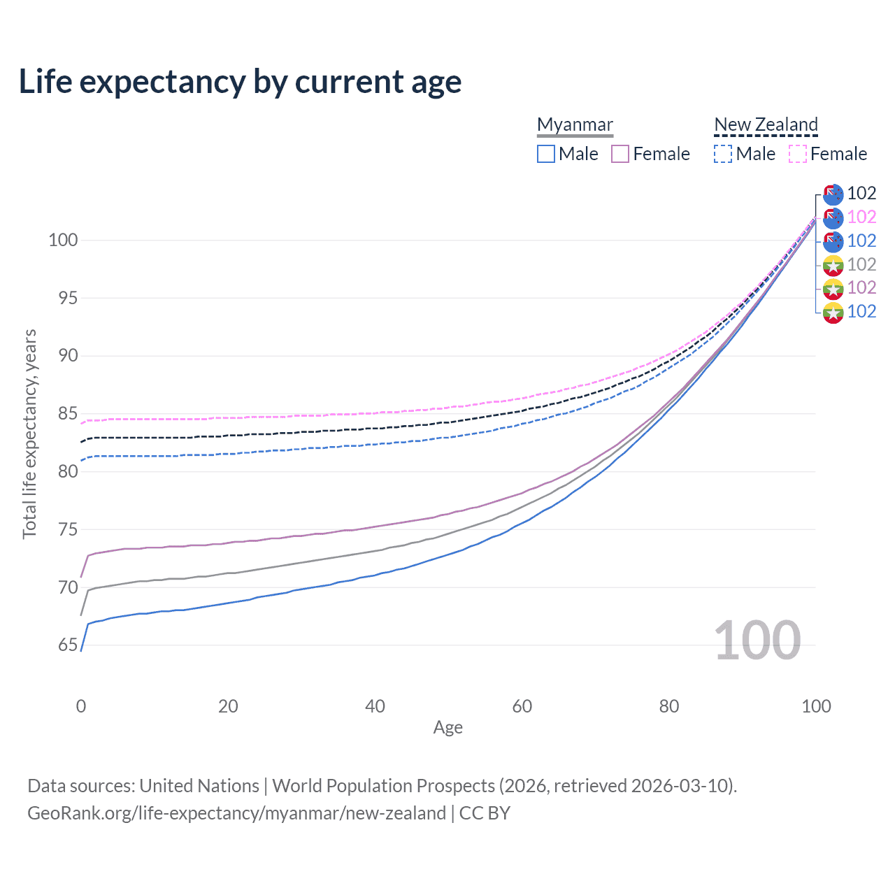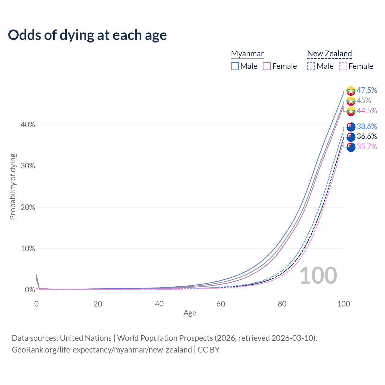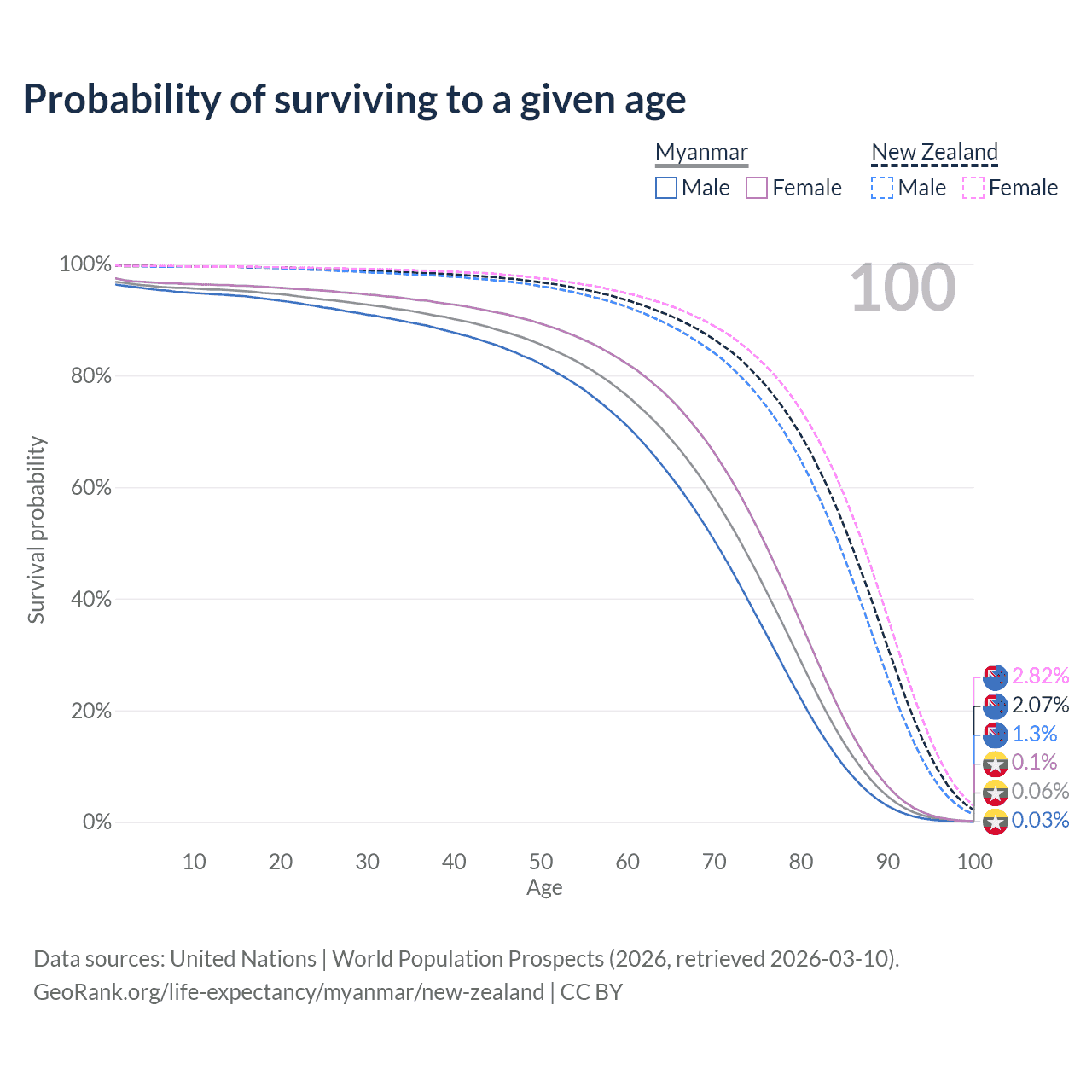 This life expectancy calculator shows the odds of living to 100, 95, 90, and below based on current age for both males and females in Myanmar and New Zealand, along with mean and median age of death. The calculations are based on the 2026 life tables (actuarial tables) from the UN World Population Prospects.