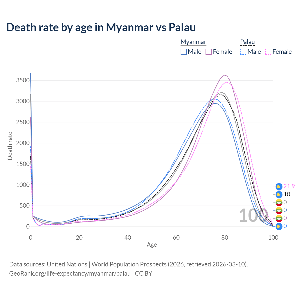 In Myanmar, the most common age of death is 79, compared to 78 in Palau. The median age of death is 73.1 in Myanmar and 73.8 in Palau, meaning only half of each cohort is expected to live past that age.
