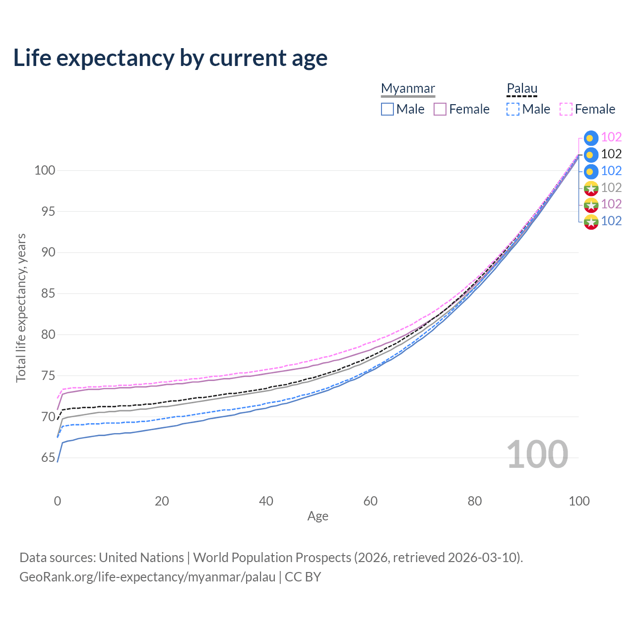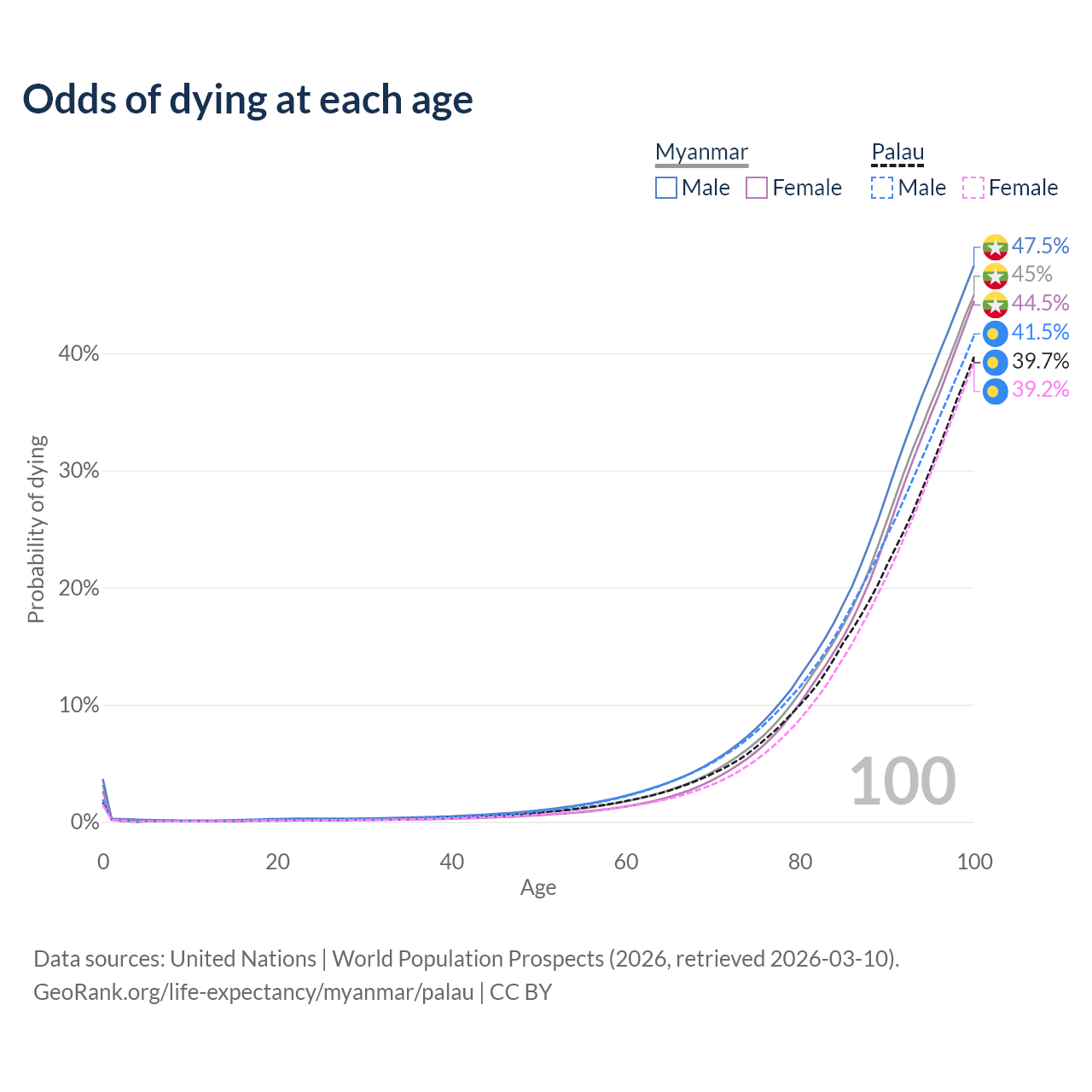 This life expectancy calculator shows the odds of living to 100, 95, 90, and below based on current age for both males and females in Myanmar and Palau, along with mean and median age of death. The calculations are based on the 2026 life tables (actuarial tables) from the UN World Population Prospects.