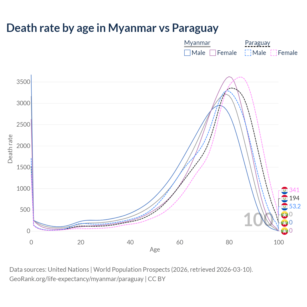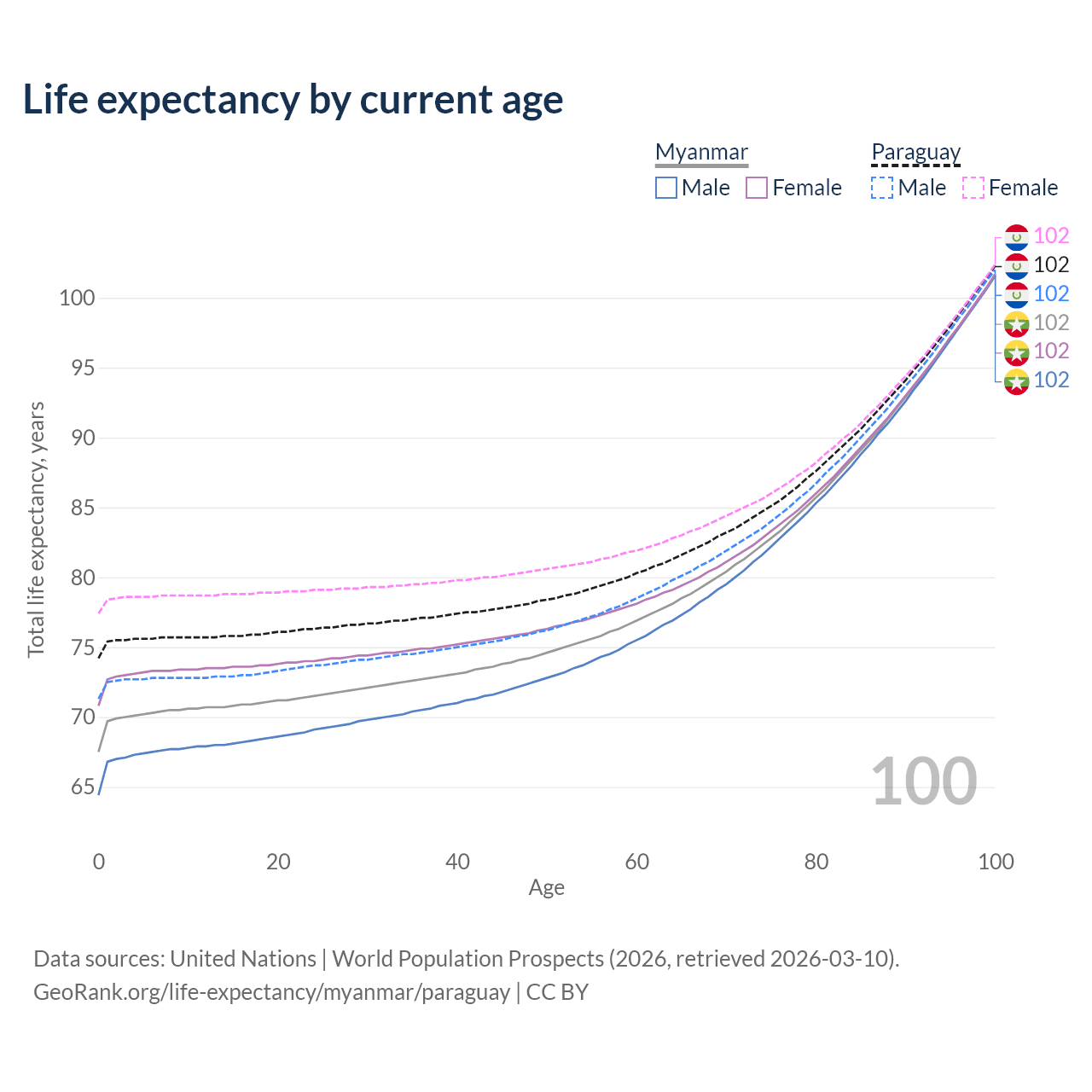 This life expectancy calculator shows the odds of living to 100, 95, 90, and below based on current age for both males and females in Myanmar and Paraguay, along with mean and median age of death. The calculations are based on the 2026 life tables (actuarial tables) from the UN World Population Prospects.