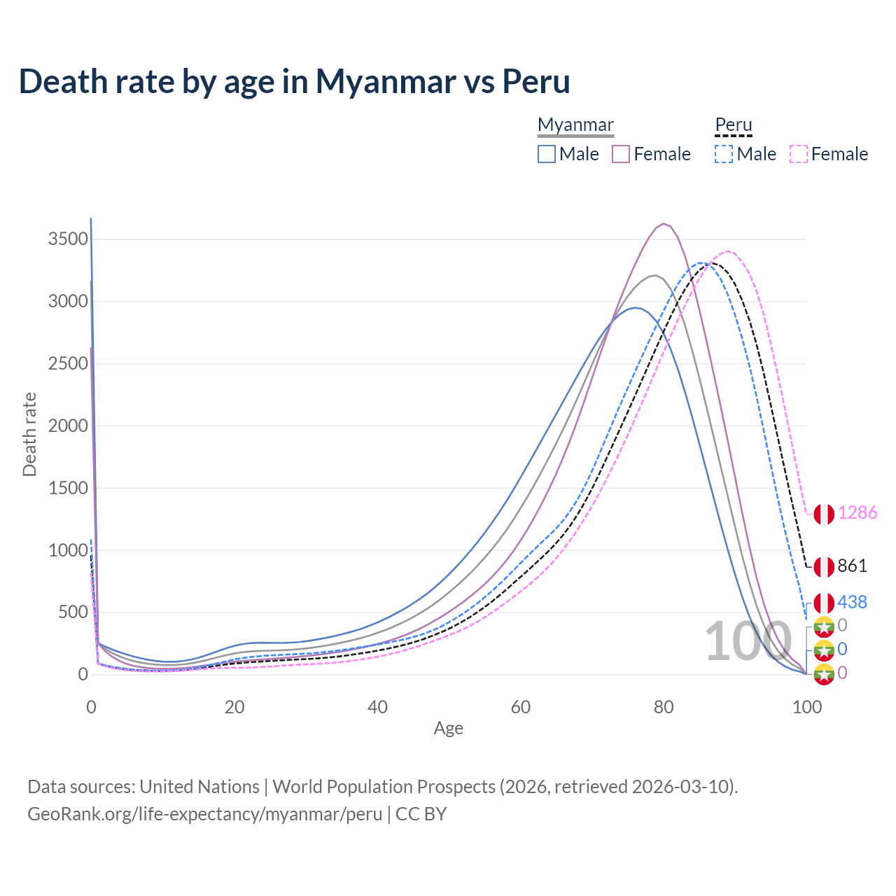 In Myanmar, the most common age of death is 79, compared to 87 in Peru. The median age of death is 73.1 in Myanmar and 82.4 in Peru, meaning only half of each cohort is expected to live past that age.