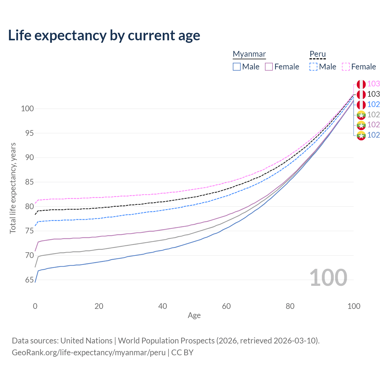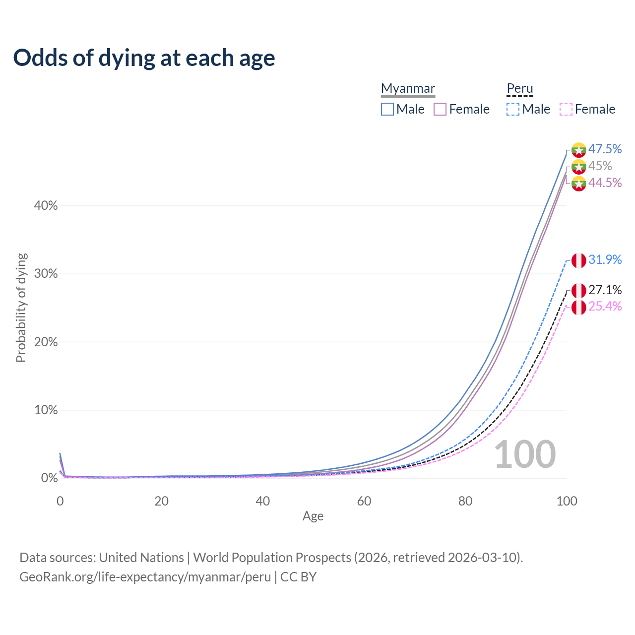 This life expectancy calculator shows the odds of living to 100, 95, 90, and below based on current age for both males and females in Myanmar and Peru, along with mean and median age of death. The calculations are based on the 2026 life tables (actuarial tables) from the UN World Population Prospects.