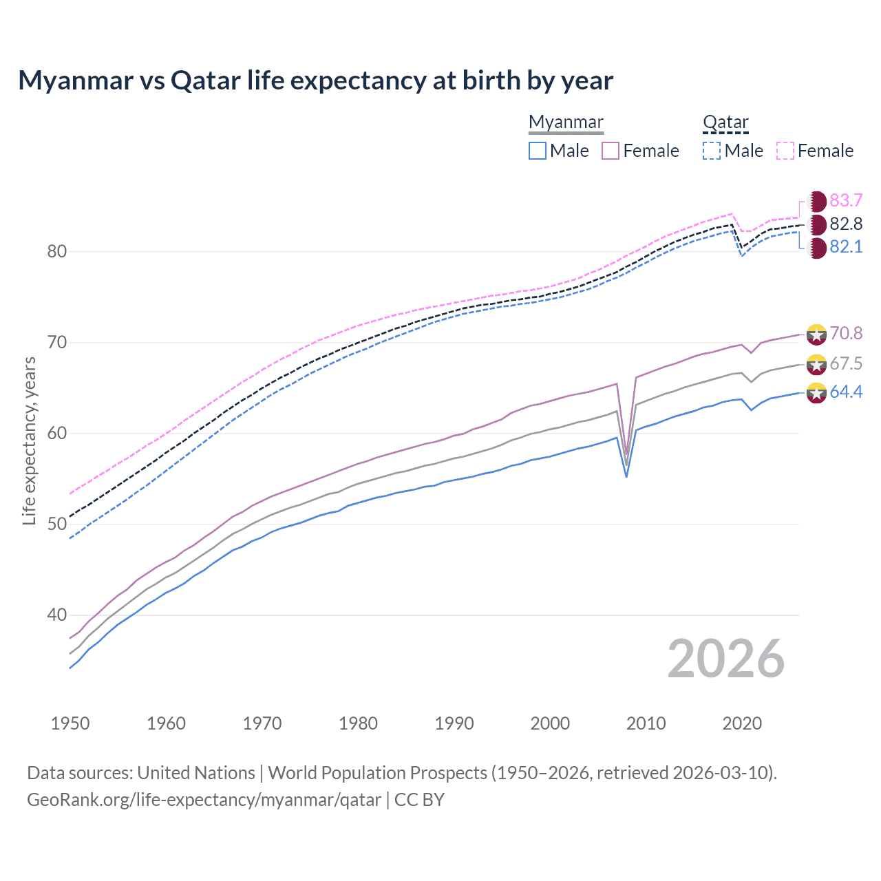 The average life expectancy at birth is 67.5 years in Myanmar vs 82.8 in Qatar. Myanmar is ranked 157/197 by life expectancy, and Qatar is 23/197. In Myanmar, the life expectancy is 64.4 years for males and 70.8 years for females. In Qatar, it's 82.1 years for males and 83.7 years for females.