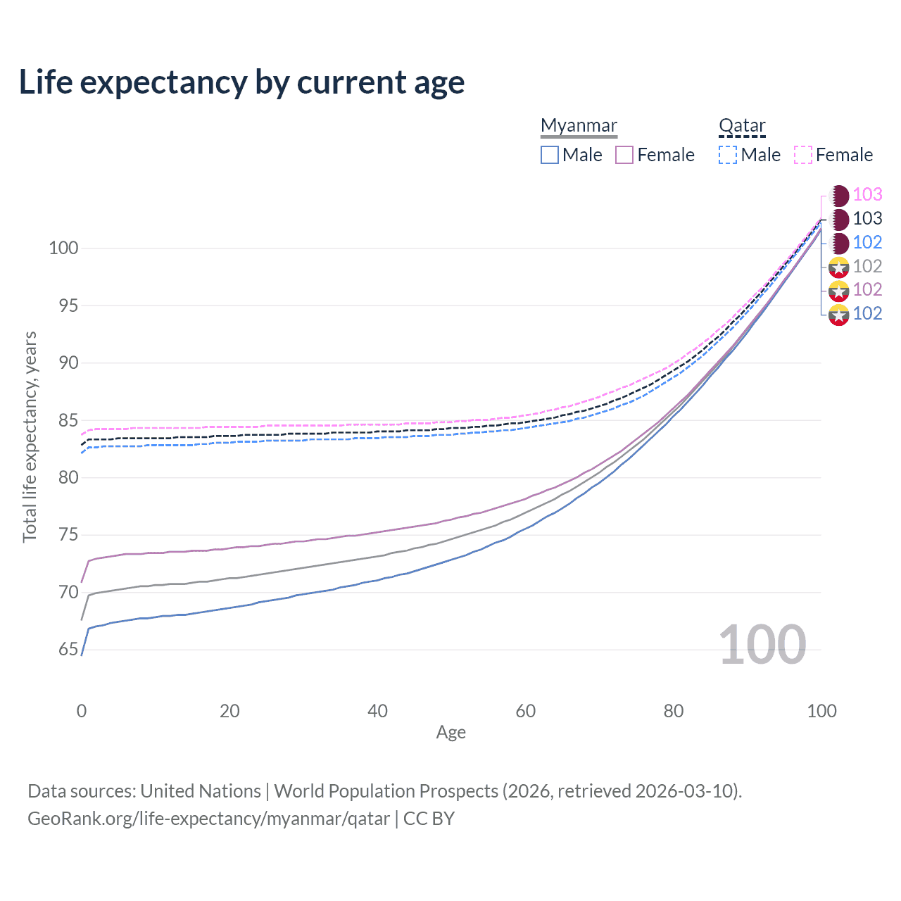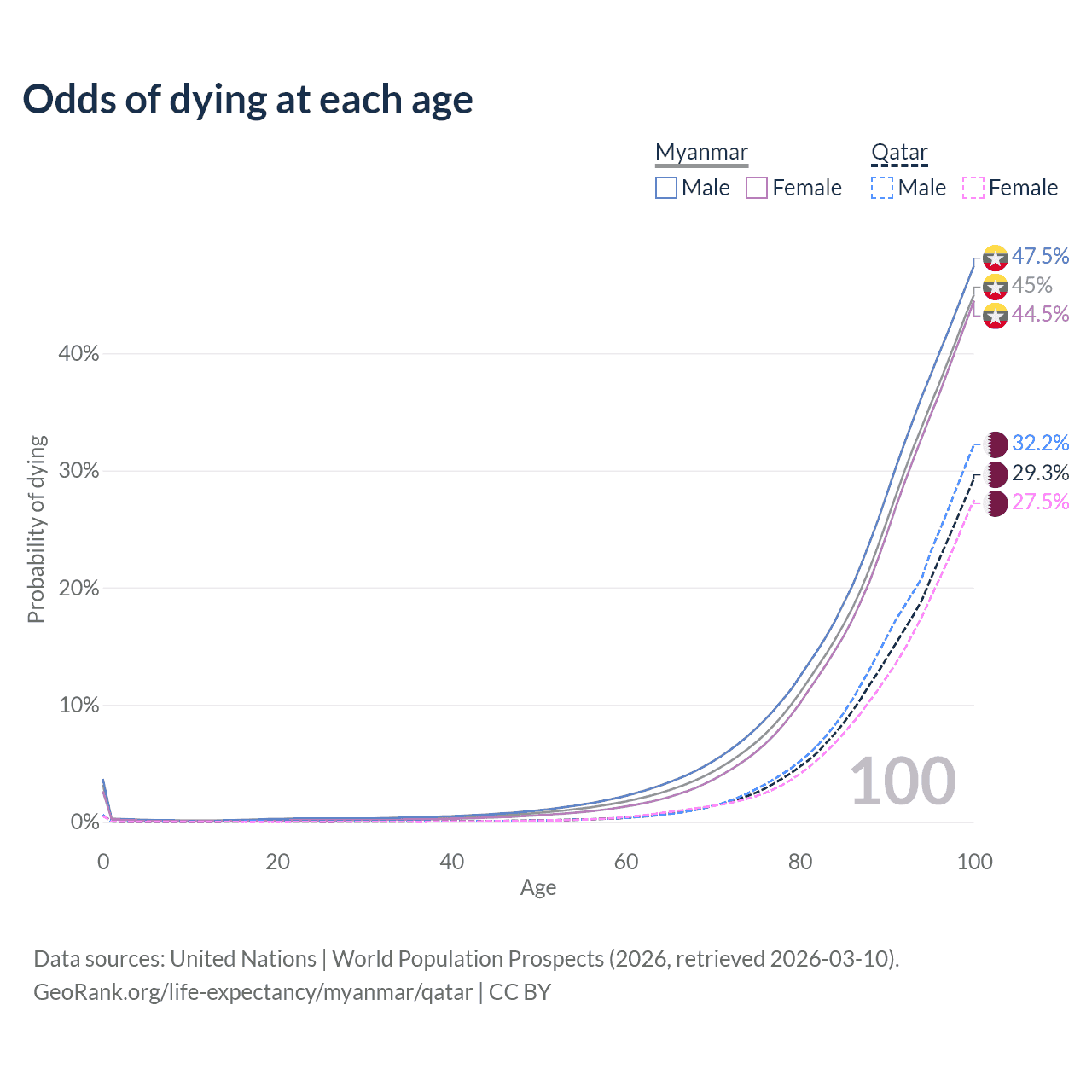 This life expectancy calculator shows the odds of living to 100, 95, 90, and below based on current age for both males and females in Myanmar and Qatar, along with mean and median age of death. The calculations are based on the 2026 life tables (actuarial tables) from the UN World Population Prospects.