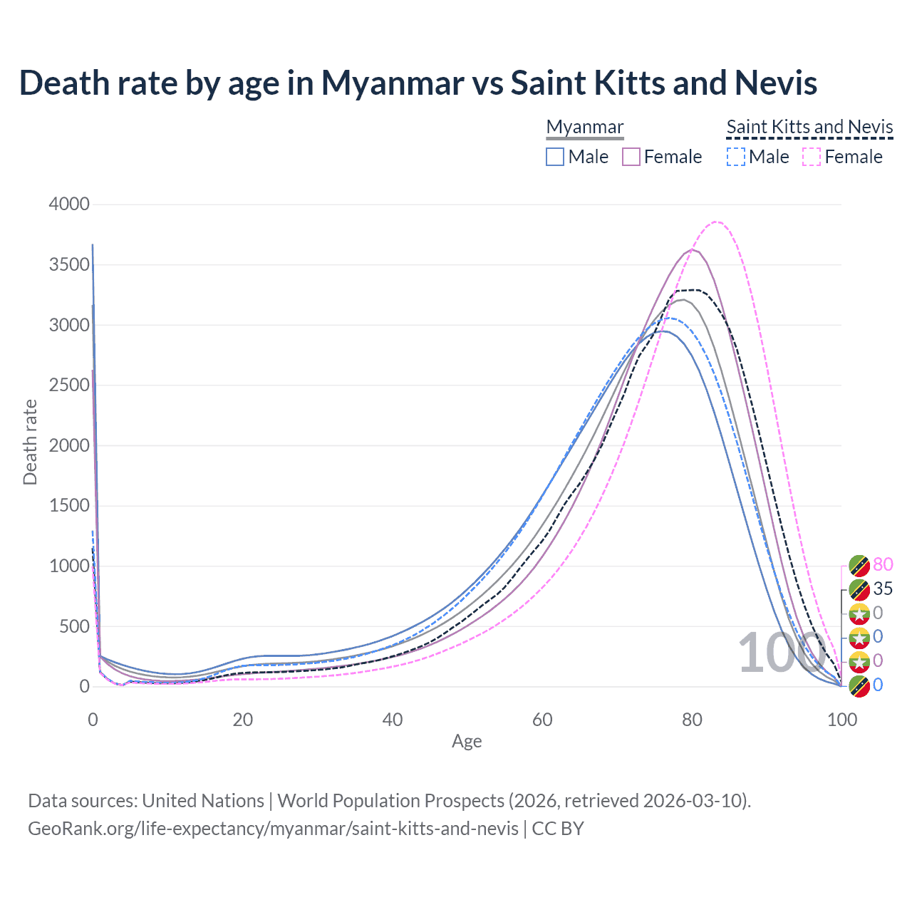 In Myanmar, the most common age of death is 79, compared to 80 in Saint Kitts and Nevis. The median age of death is 73.1 in Myanmar and 76.3 in Saint Kitts and Nevis, meaning only half of each cohort is expected to live past that age.