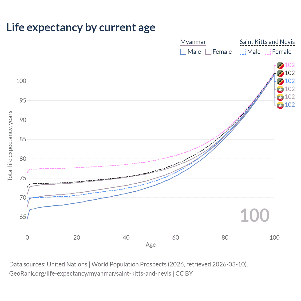 This life expectancy calculator shows the odds of living to 100, 95, 90, and below based on current age for both males and females in Myanmar and Saint Kitts and Nevis, along with mean and median age of death. The calculations are based on the 2026 life tables (actuarial tables) from the UN World Population Prospects.