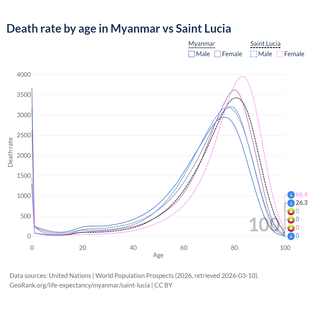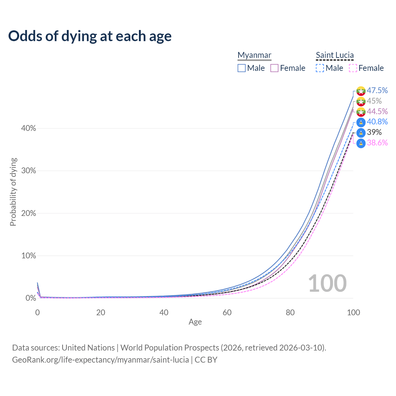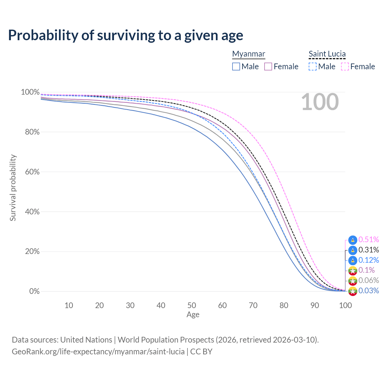 This life expectancy calculator shows the odds of living to 100, 95, 90, and below based on current age for both males and females in Myanmar and Saint Lucia, along with mean and median age of death. The calculations are based on the 2026 life tables (actuarial tables) from the UN World Population Prospects.